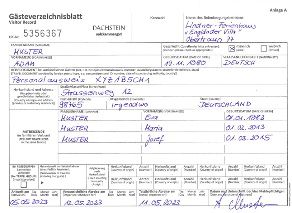 Bitte geben Sie daher die Meldezettel spätestens am 3. Tag ausgefüllt im Tourismusbüro ab. Das Tourismusbüro befindet sich im ca. 3 km entfernten Gemeindeamt, Obertraun 180 (die Seestraße entlang, beim „Obertrauner Hof“ rechts, bei „Nah & Frisch Supermarkt“).