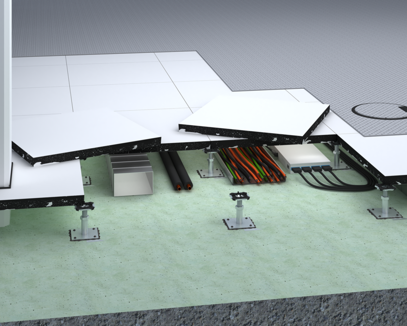 Der Doppelboden LOOP ist mit seinen hervorragenden technischen und bauphysikalischen Eigenschaften das optimale Produkt für nahezu alle Anwendungszwecke. Die aufbereiteten Doppelbodenplatten bestehen aus faserverstärktem Calciumsulfat und sind unterseitig mit Stahlblech beklebt. Umlaufend sind die Platten mit originalem Kantenschutz gegen Stoß und Feuchte versehen. Die Unterkonstruktion, die den nötigen Hohlraum für Installationen schafft, besteht aus höhenverstellbaren Stahlstützen mit Korrosionsschutz aus eigener Produktion und Auflageplättchen zur Schallentkopplung.