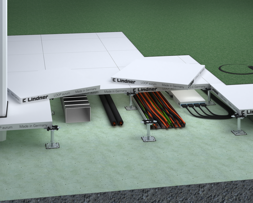 Die auf fünf Seiten aufbereiteten Doppelbodenplatten bestehen aus Calciumsulfat. LOOP aurum kommt dabei ohne Kantenbänder und unterseitiger Applikation aus. Selbstliegende Bodenbeläge werden auf der Baustelle verlegt.