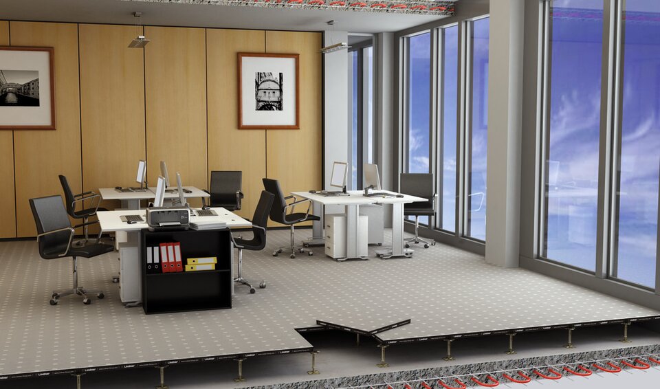 Die perforierten Doppelbodenplatten Typ acoustic bestehen aus einem Calciumsulfatplattenkern, einem qualifizierten Oberbelag und optionalem Akustikvlies oder einem Akustikelement zur Regulierung der Raumakustik bzw. Optimierung des Schallabsorptionsgrades. Unterseitig sind die Platten mit HF beschichtet.