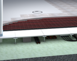 Der Trockenhohlboden HYDRO power wurde speziell für Schwerlastbereiche und für Flächen mit erhöhtem Feuchtigkeitseintrag entwickelt. Das feuchtebeständige Bodensystem besteht aus hochverdichteten Zementfaserplatten mit optimierter Plattenrezeptur, die die Wasseraufnahme effektiv verhindern. Die Verklebung der HYDRO power Platten erfolgt über eine Verzahnfräsung an den Kanten der Platte, wodurch eine geschlossene Tragschicht entsteht.