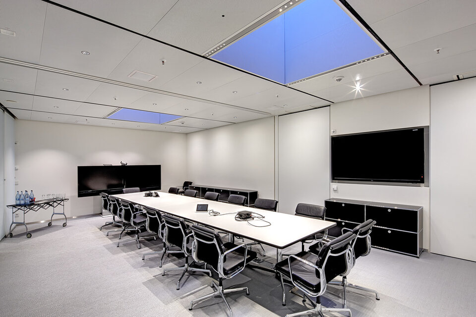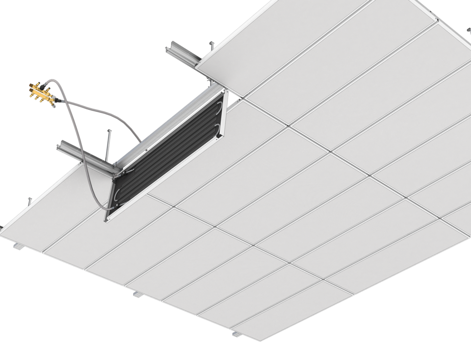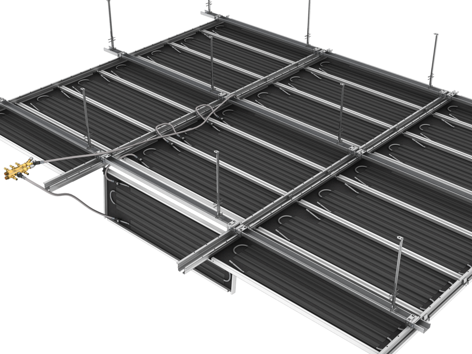 Die Einhängedecke mit verdeckter Unterkonstruktion und offener Fuge erreicht eine angenehme und behagliche Temperierung. Die offene Fuge zwischen den Deckenplatten hat nicht nur einen architektonischen Effekt, sondern kann auch zur Luftüberströmung sowie zur unabhängigen Installation von Leuchten oder anderen Einbauten genutzt werden. Die werkzeuglos bedienbaren Deckenplatten können in Bezug auf Form und Größe individuell gestaltet werden. Auf Wunsch lassen sich thermisch aktive und passive Bereiche kombinieren.