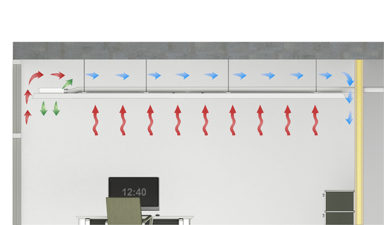 Plafotherm® DS AirHybrid ist ein Multifunktionsdeckensegel mit geführter Zuluft, das zur Aktivierung des Betonkerns genutzt werden kann. Das Zuluftelement ist rückseitig verdeckt in den Deckenplatten integriert und raumseitig nicht sichtbar. Durch die perforierten Deckenplatten und die Induktionsauslässe an dem Hybrid-Lüftungselement verteilt sich die Luftausströmung gleichmäßig temperiert nach unten bzw. oberhalb der Decke, ohne unangenehme Zugluft zu erzeugen. Somit sind nach DIN, ISO und SIA Behaglichkeit sowie ein angenehmes Raumklima sichergestellt.