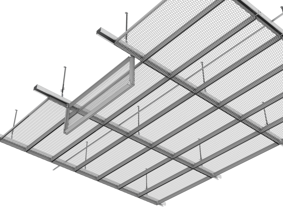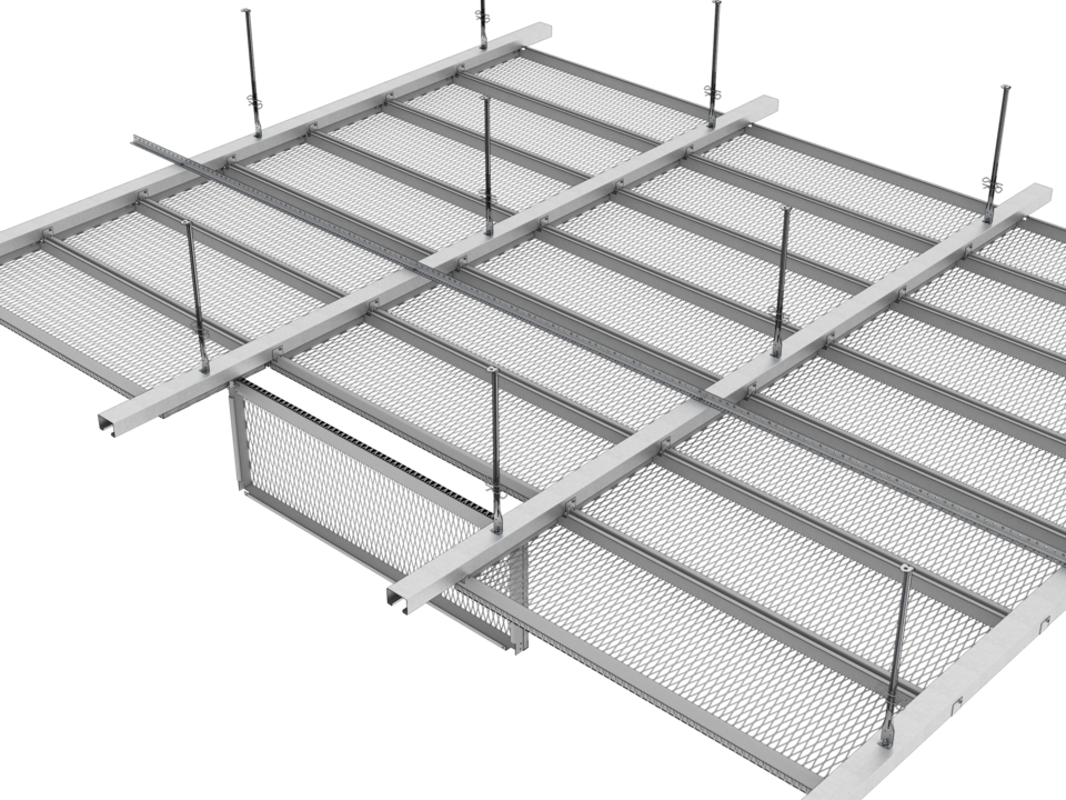 Das System LMD-St 213 überzeugt durch gestalterische Freiheit und hohe Revisionsfreundlichkeit. Verschiedenste Maschenarten, -formen und -größen stehen Ihnen zur Auswahl – welches Design Sie auch wählen, die Deckenplatten sind mit Sicherheit abnehmbar und auf Wunsch auch abklappbar. Optische Highlights können Sie mit betonten Fugen bis zu 30 mm oder hinterleuchteten Streckmetalldeckenplatten setzen.