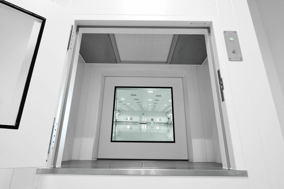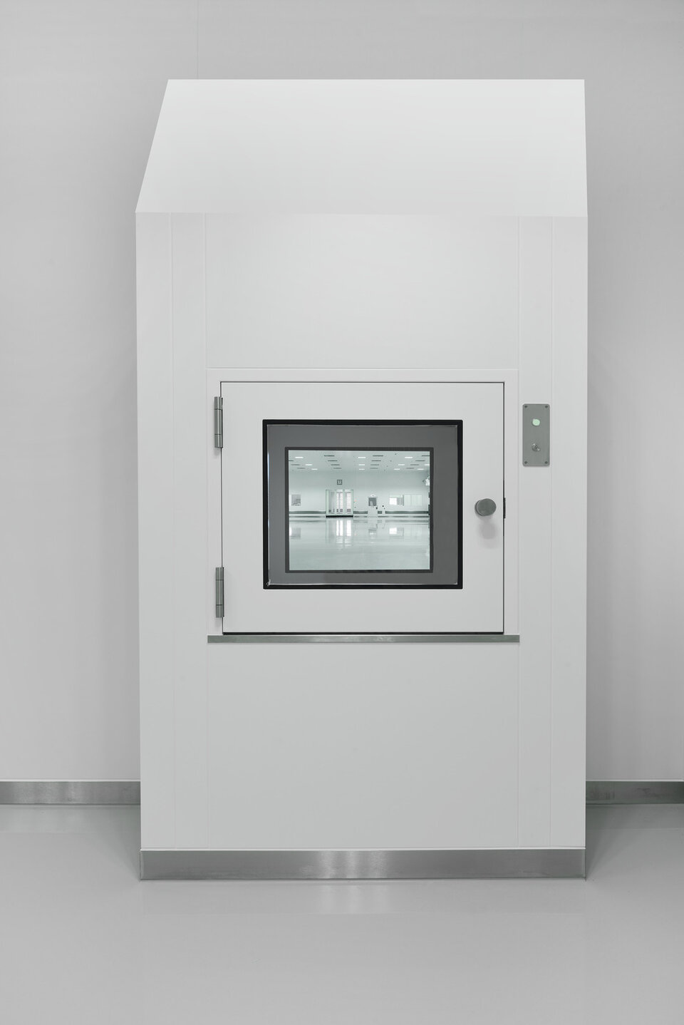 Die Materialdurchreiche dient in erster Linie dazu auf schnellstem Wege Materialien aus bzw. in die Herstellungsbereiche zu schleusen. Gleichfalls eignet sie sich dazu Musterzüge oder Stichproben zur Qualitätskontrolle auszubringen, ohne dabei aufwändig Personen ein- und auszuschleusen. Sie besitzt zwei Türen mit Glasausschnitt, die gegenseitig elektrisch verriegelt sind. Es handelt sich dabei um eine „bevorzugt offene“ Verriegelung, bei der die jeweilige Gegenseite erst verriegelt wird, sobald eine der beiden Türen geöffnet wird. Die Materialdurchreiche wird aus dem bereits projektierten Wandsystem und standardisierten Einbauten erstellt. Optional kann die Materialdurchreiche auch mit einem Umluftgebläse ausgestattet werden, was sie zu einer aktiven Einheit macht. Zusätzlich ist auch eine Anbindung an bauseitige Lüftungsanlagen möglich.