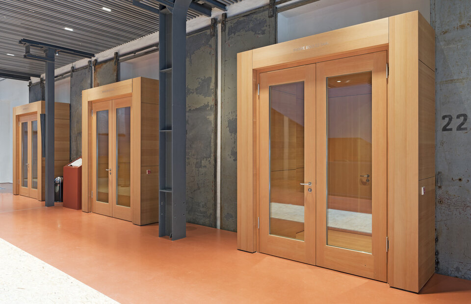 Holzrahmen-Türblatt, ca. 68 mm in 1-flügeliger und 2-flügeliger Ausführung (Interne Produktbezeichnung Typ I-HRT und M-HRT) mit Brandschutzanforderung T30 (Rauchschutz, Schallschutz, Einbruchschutz und Feuchtraumanforderung optional möglich).