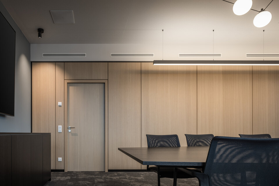Die Systemtrennwand aus Holz lässt sich auch während des laufenden Geschäftsbetriebs jederzeit versetzen.
