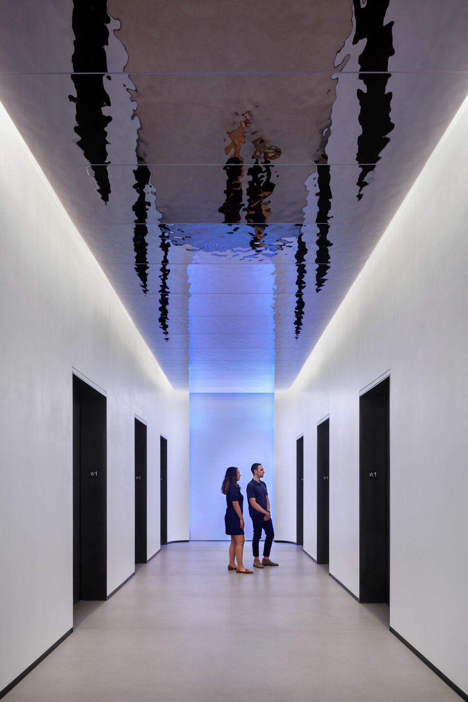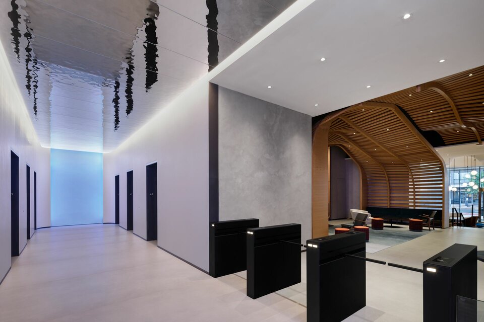 Die Nähe des Gebäudes zum Anacostia River hat Lindner dazu inspiriert, die Oberfläche LUNAR (gehämmerter Edelstahl) zu verwenden, um das Plätschern des Wassers zu imitieren und gleichzeitig die Funktionalität einer vollständig zugänglichen Decke zu erhalten.