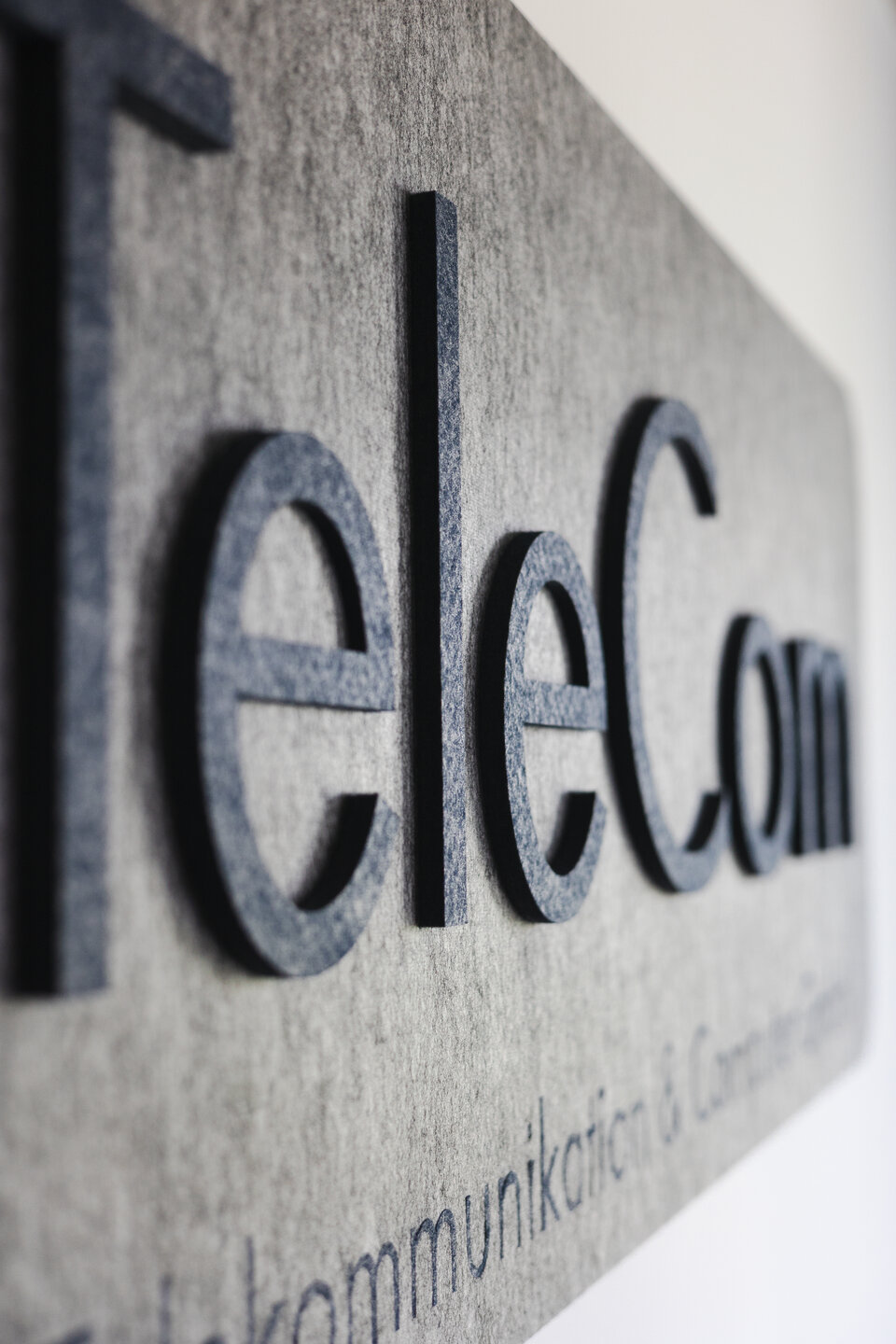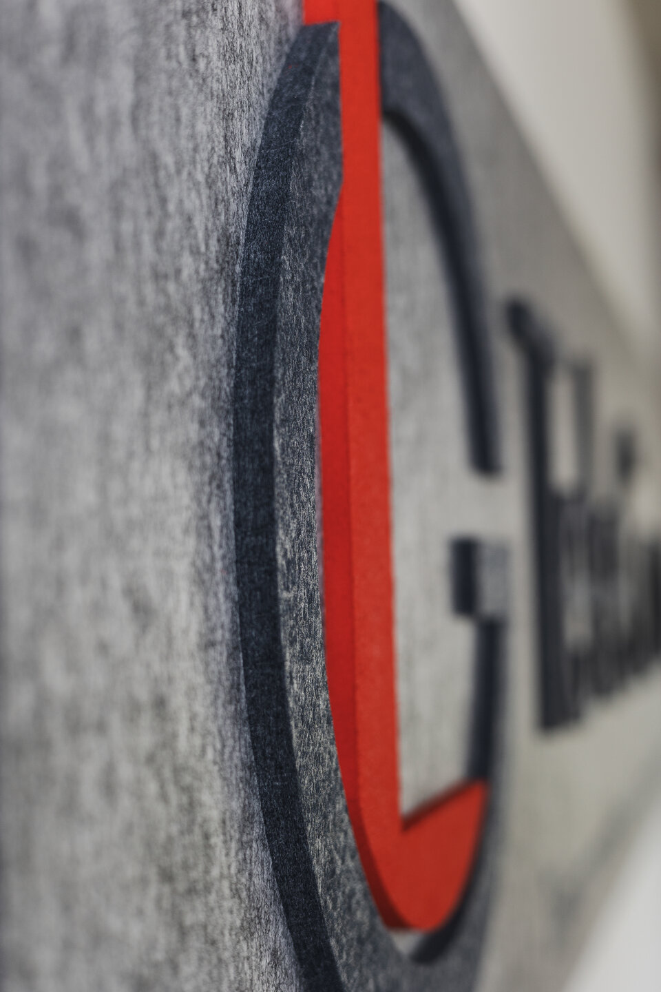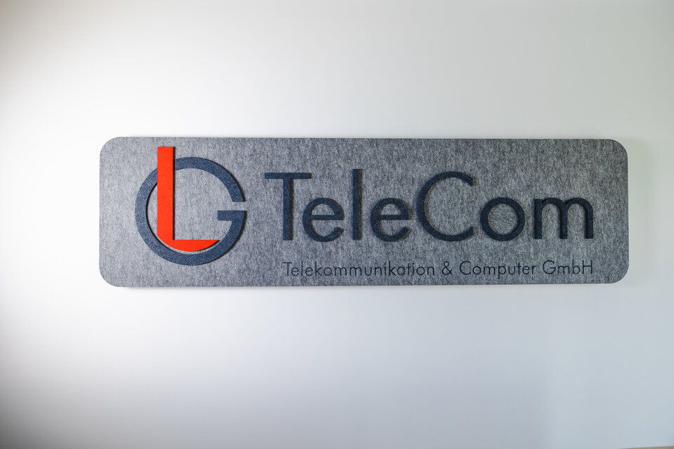 Ein besonderes Highlight ist die Integration des Unternehmenslogos von LG TeleCom direkt auf einigen der Akustikelemente. So werden die MUTE+® Wandabsorber zu einem Teil des visuellen Erscheinungsbildes und unterstützen das Corporate Branding im gesamten Bürobereich.