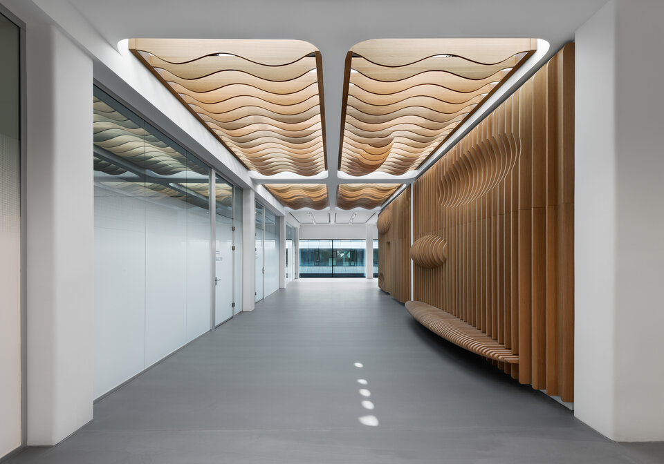 Ein weiteres zentrales Gestaltungselement, das maßgeblich zur hohen Aufenthaltsqualität beiträgt, sind die großformatigen Heiz-/Kühldecken der Lindner Group.