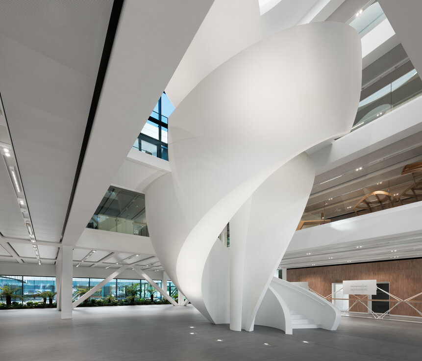 Die Einhängedecke Plafotherm® E 200 sorgt durch Strahlungsheizung und -kühlung für ein angenehmes Raumklima und überzeugt mit ihrer energieeffizienten Wirtschaftlichkeit. Diese wurden als Insellösungen mit großformatigen, gerundeten Deckenfelder in schlichtem Weiß mit einer umlaufend offenen Schattenfuge ausgeführt, was den Räumen eine angenehme Leichtigkeit verleiht.
