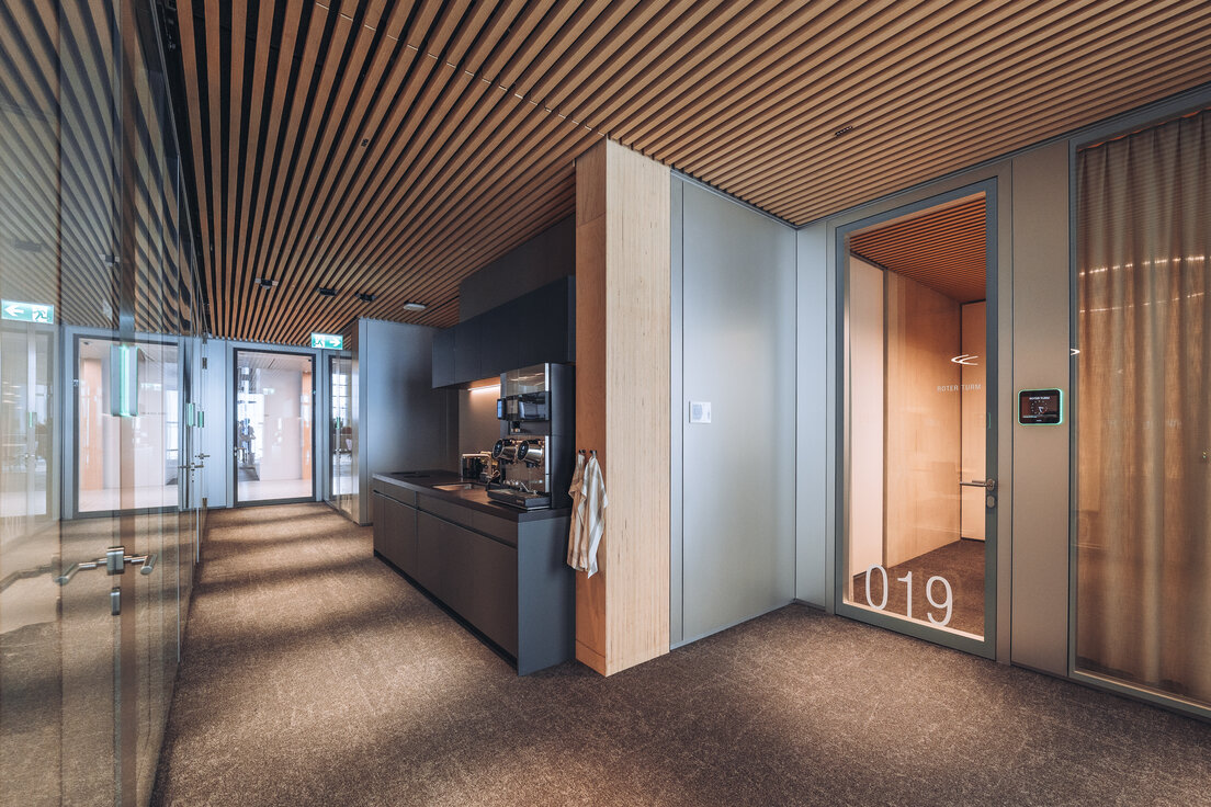 Für die transparente Raumgliederung kamen Glastrennwände vom Typ Lindner Life Contour 126 zum Einsatz, die mit klaren Linien und hoher Schalldämmung überzeugen. Ergänzt wurden diese durch die Metalltrennwand Lindner Logic 100. Beide Systeme bieten nicht nur gestalterische Qualität, sondern erfüllen auch höchste Anforderungen an Akustik und Funktionalität. Abgeschlossen werden die Wandsysteme durch die Aluminium-Rohrahmentür ATB 68 sowie die ATB ADS 80 Fr 30, die zusätzlich einen wirksamen Brandschutz bietet.