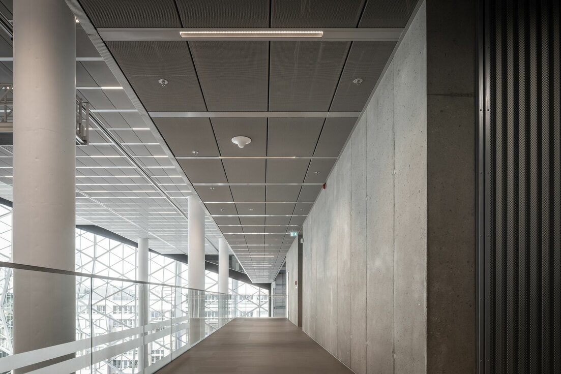 Für eine gutfunktionierende räumliche Umsetzung der neuen Arbeitswelten kamen u. a. Lindner Boden- und Deckensysteme zum Einsatz. So entschied man sich z. B. für verschiedene Ausführungen des Doppelbodensystem NORTEC bzw. für den Hohlboden FLOOR and more®, um kilometerlange IT-Leitungen, Brandabschottungen etc. großflächig im Boden zu verbergen. Auch die Deckensysteme aus Streckmetall ergänzen das Raumkonzept sowohl optisch als auch funktional. In Kombination mit Plafotherm® KN Konvektionselementen sorgt die Deckenlösung für eine effiziente und konstante Temperierung. In den Mittelabhängungen sind Leuchten, Sprinkler und Präsenzmelder ebenfalls bereits impliziert. Darüber hinaus setzte Lindner auch viele der individuelle Gestaltungswünsche um, wie z. B. goldfarbene Metallverkleidungen in den Zugangsbereichen der Aufzüge, die einen optischen Bezug zum angrenzenden Axel-Springer-Hochhaus mit seiner goldfarbenen Fassade herstellen. Trockenbauelemente, weitere Wand- und Deckenverkleidungen sowie Türen wurden ebenfalls dem hochwertigen Material- und Farbkonzept im Axel-Springer-Neubau angepasst und teils individuell von Lindner gefertigt.