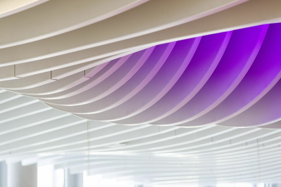 Im Rahmen dieses Bauvorhabens wurde Lindner mit einem umfangreichen Ausbaupaket beauftragt. So wurde der respräsentative Eingangsbereich mit Lindner Gipskartonheiz- u. Kühldecken ausgestattet. Dort und auch in weiteren Gebäudeteilen wurden außerdem Trockenbau- bzw. Innenputzarbeiten ausgeführt. Die Bürobereiche wurden großflächig mit Lindner Metalldecken ausgestattet, die teilweise über integrierte Heiz- und Kühltechnik verfügen. Für räumliche Abtrennung in diesen Flächen sorgen Lindner Systemtrennwände mit integrierten Türen. Zusätzliche Türelemente aus Holz und Edelstahl wurden ebenfalls eingebracht. Optisch losgelöst präsentieren sich der Konferenzbereich sowie die Mitarbeiterkantine, wo in beiden Fällen perforierte Lamellendecken mit teilweise integrierter Heiz- u. Kühltechnik zum Einsatz kamen. Die Mitarbeiterkantine sticht dabei mit der wellenförmigen LMD-L LAOLA und ihrer integrierten LED-Lichttechnik hervor. Das Leistungsspektrum der Lindner Group wird durch zahlreiche Möbel als Festeinbauten sowie die Bühne des Konferenzbereichs abgerundet.