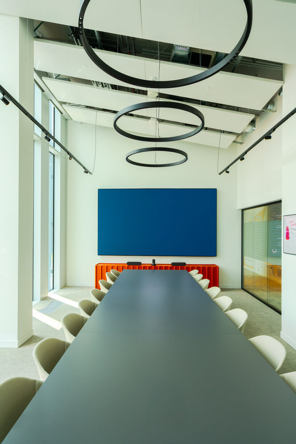 Ergänzend dazu wurden AirBox S Zuluftelemente geliefert, die verdeckt in die Rückseite der Deckensysteme integriert sind und für eine gleichmäßige und angenehme Frischluftzufuhr sorgen. Die Kombination beider Systeme schafft eine technisch wie gestalterisch hochwertige Lösung, die das Raumklima optimiert und sich harmonisch in das architektonische Gesamtkonzept des Gebäudes einfügt.