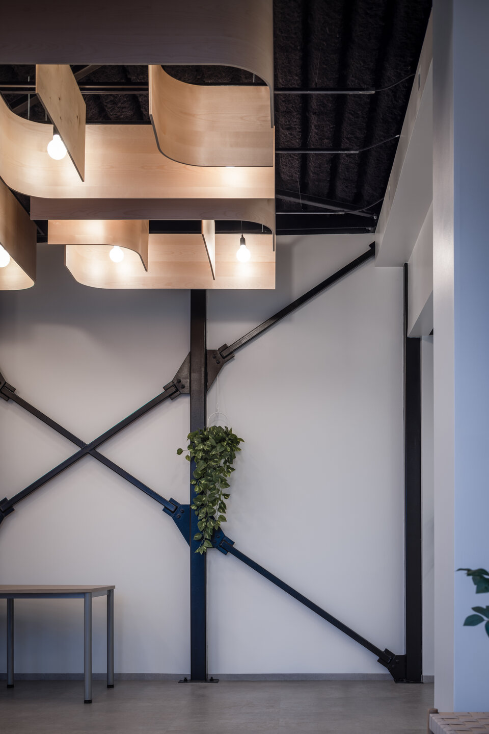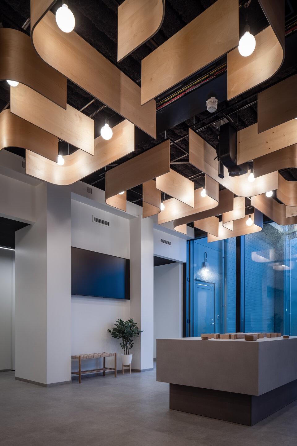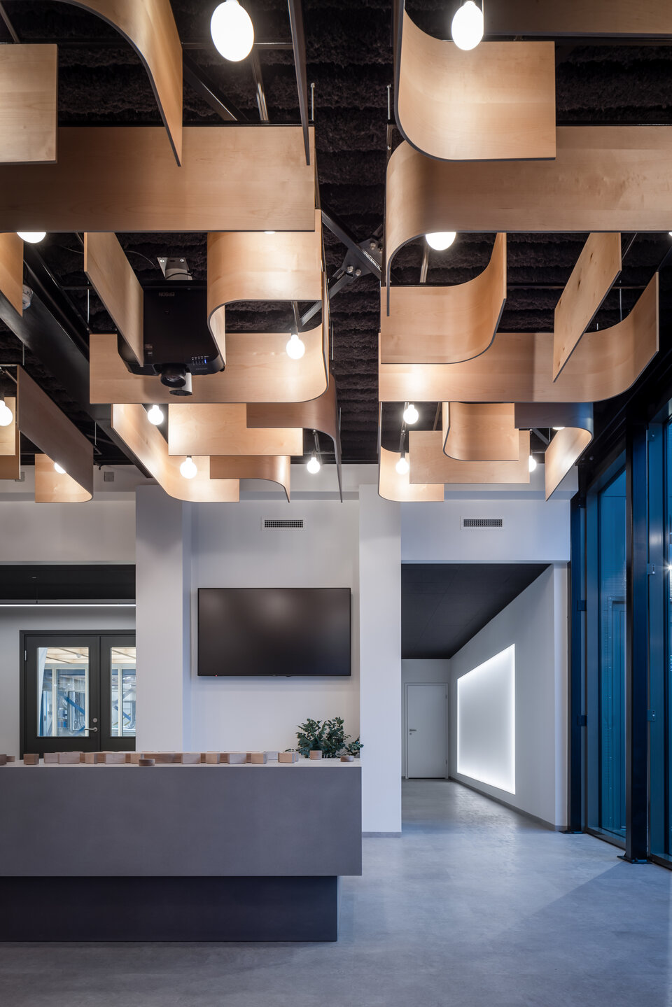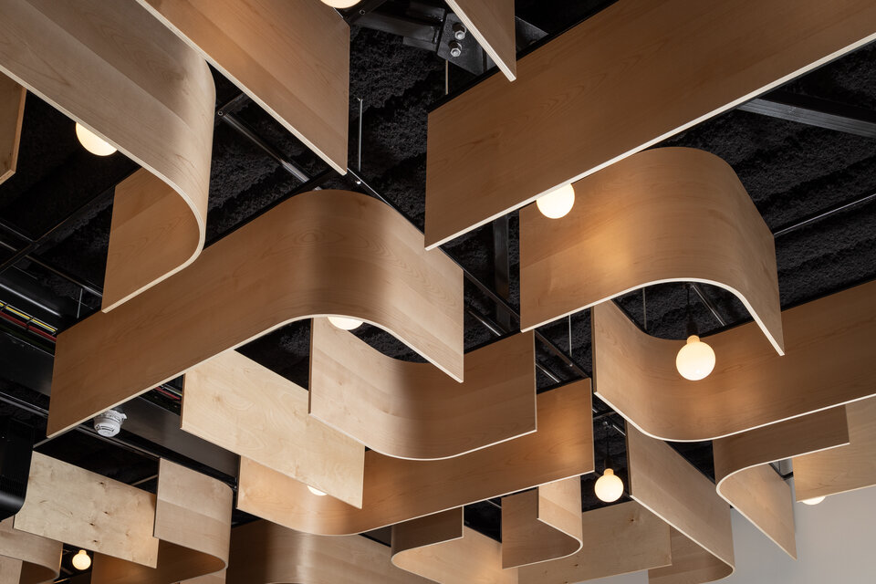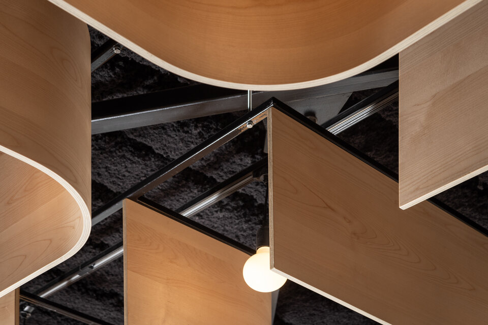 Zwischen den Paneelen setzen runde Hängeleuchten stimmungsvolle Akzente und tauchen den Raum in ein warmes, einladendes Licht. Die natürlichen Holztöne der Deckenelemente harmonieren dabei elegant mit dem dunklen Hintergrund der darüberliegenden Decke. Die besondere Deckengestaltung vermittelt ein Gefühl von Offenheit und fügt sich nahtlos in den innovativen Charakter des Gesamtprojekts ein.