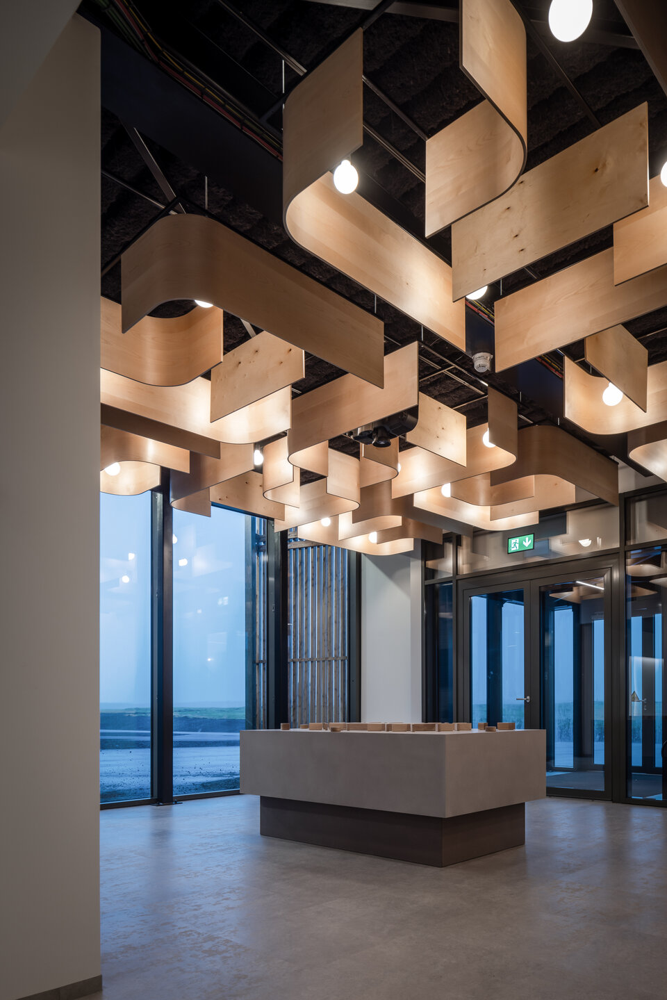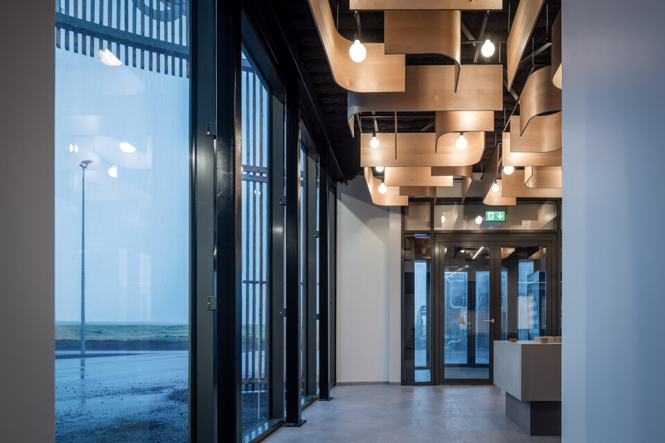Lindner war mit der Lieferung und Installation einer individuell gestalteten Holzdecke aus geschwungenen Holzpaneelen in einem der Besucherräume beauftragt. Angeordnet in unterschiedlichen Längen und Formen, entsteht ein dynamischer, wellenförmiger Effekt.