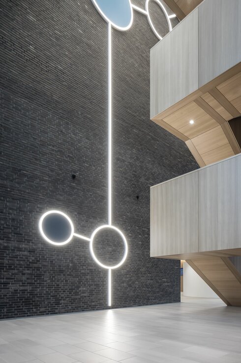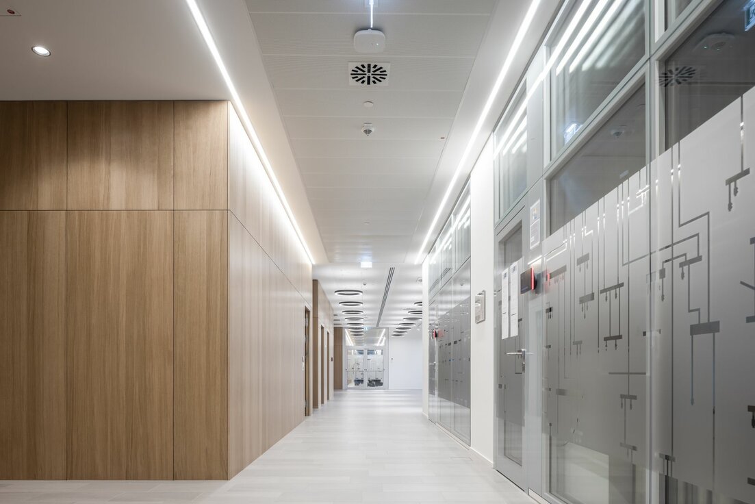 Der Firmensitz vereint in besonderem Maße Nachhaltigkeit und Energieeffizienz: Das Gebäude ist DGNB Platin zertifiziert und erfüllt die Standards BBB (Niedrigenergie) sowie CCC (Energieeffizienz). Lindner trug mit einem nachhaltigen Innenausbau wesentlich dazu bei: Viele der verbauten Systemprodukte wie der Doppelboden NORTEC und das Hohlbodensystem FLOOR and more® sind Cradle to Cradle Certified® Silber. Auch die Gewerke Wand und Decke sind besonders nachhaltig: Das in den Büroflächen verbaute Glastrennwandsystem Lindner Life Stereo ist ebenfalls Cradle to Cradle Certified® Silber, die Streckmetalldecke sogar Cradle to Cradle Certified® Gold. Weitere Vollwandtrennwände aus Holz und Metall sorgen für Separation und Privatsphäre im Gebäudeinneren. Die Corona-Pandemie stellte Lindner beim Bau der neuen Firmenzentrale jedoch vor einige Herausforderungen: Innerhalb kürzester Zeit musste auf Verzögerungen in der Lieferkette reagiert und der Montageablauf vor Ort an die neuen Gesundheits- und Sicherheitsrichtlinien angepasst werden. Trotz dieser unerwarteten Herausforderungen konnte die Baustelle durch das gut funktionierende Projektteam zur vollen Zufriedenheit der Architekten und des Kunden abgeschlossen werden.