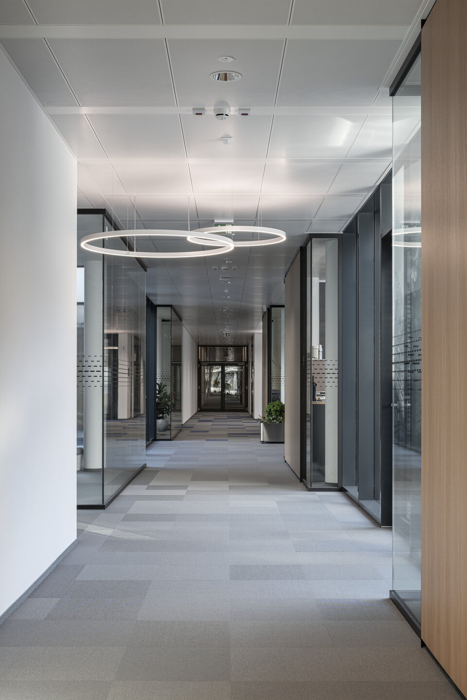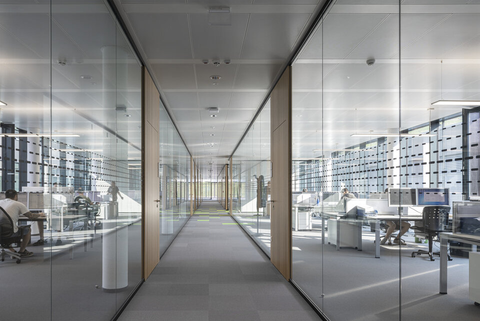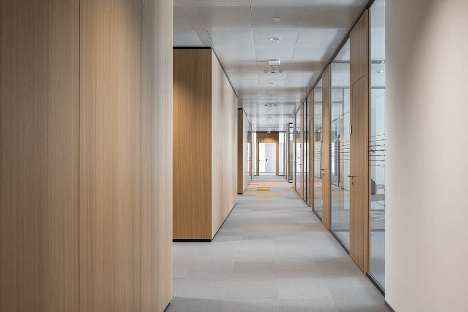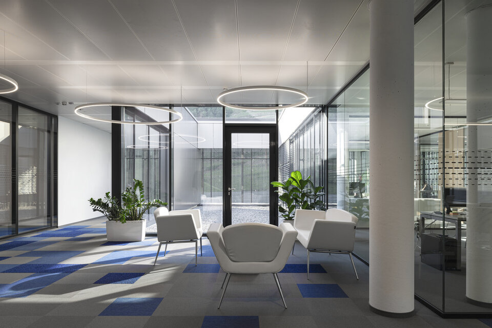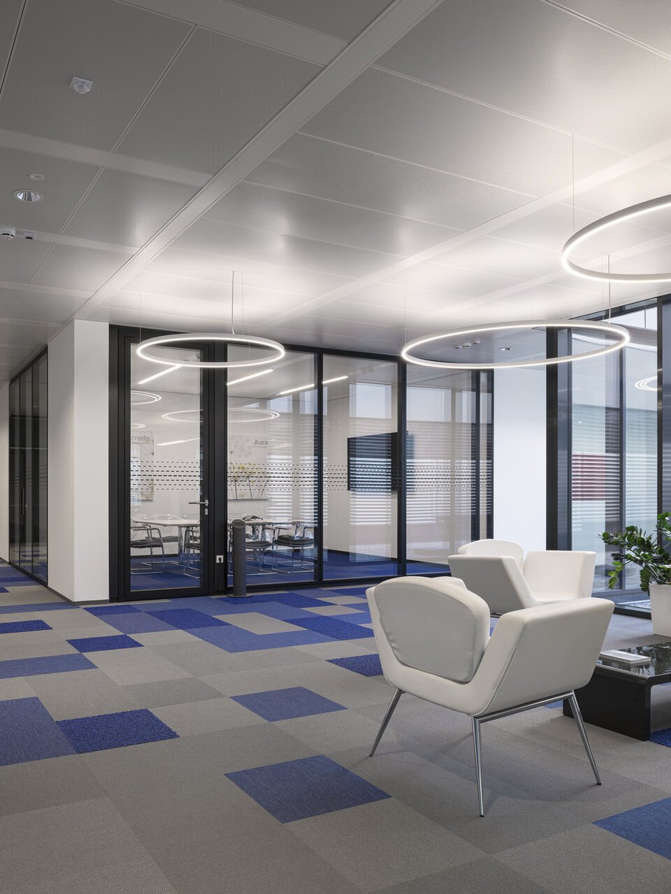 Lindner lieferte Deckensysteme mit Heiz- und Kühltechnologie sowie Systemböden für den Innenausbau von duka 4.0. Bandrasterdecken des Typs Plafotherm® B 100 wurden großflächig eingebracht, um die Gebäudetemperatur auf effiziente und nachhaltige Art und Weise zu regulieren. Über die integrierten Lüftungselemente des Typs AirBox S/E wird zudem auch die Belüftung der Räumlichkeiten gewährleistet. Eine Variante sind Gipskartonheiz-/kühldecken des Typs Plafotherm® GK HEKDA, welche an ausgewählten Stellen Einsatz fanden. Das Gebäude ist ebenfalls großflächig ausgestattet mit Lindner Systemböden, insbesondere FLOOR and more® Hohlböden sowie stellenweise die besonders tragfähige Variante FLOOR and more® power. Mit NORTEC Doppelböden wurden Revisionsöffnungen in der ansonsten geschlossenen Bodenfläche ausgebildet.