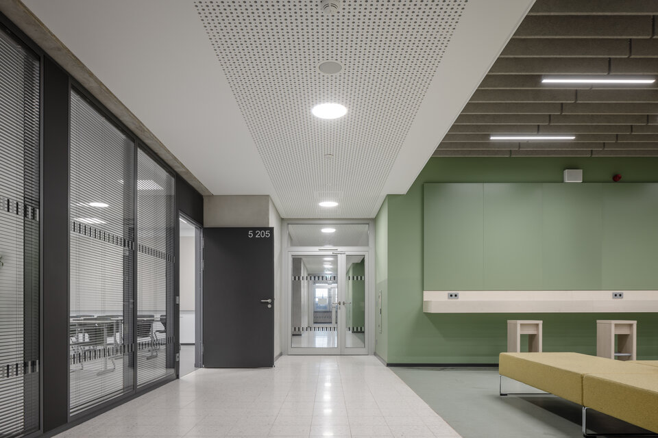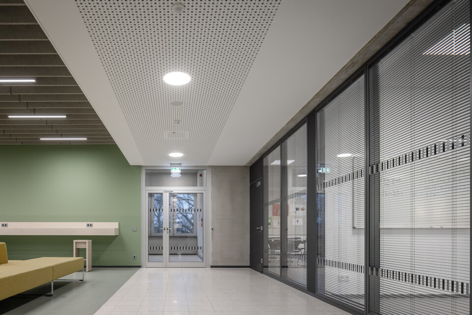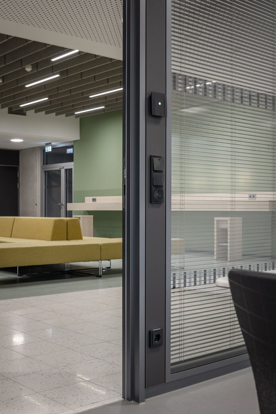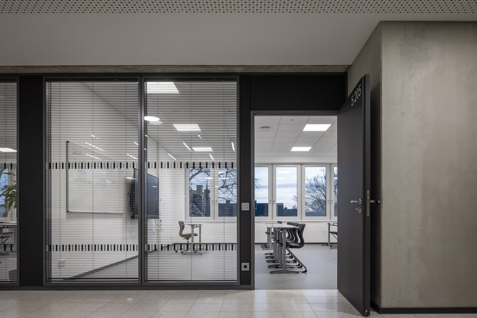 Ein Teil der Abtrennungen zwischen Flur und Klassenzimmern wurde mit manuellen oder elektrischen Jalousien ausgestattet. Dadurch lassen sich Transparenz und Sichtbeziehungen situationsabhängig steuern – etwa für Prüfungen, Präsentationen oder konzentrierte Arbeitsphasen.
