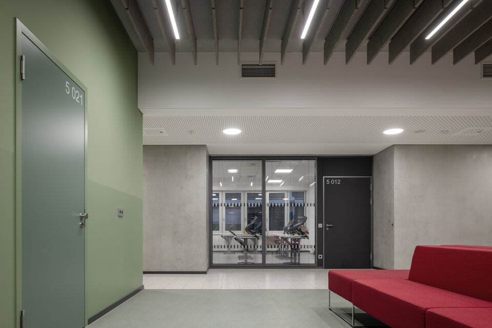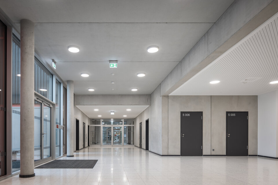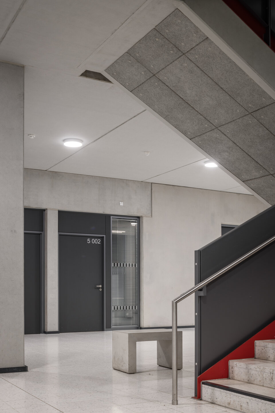 Insgesamt umfasst der Neubau 18 Klassenräume, drei Informatikräume, drei Multifunktionsräume sowie sechs Clusterräume. Die räumliche Offenheit fördert Kommunikation und Zusammenarbeit, während gezielte Zonierungen Rückzug und konzentriertes Arbeiten ermöglichen. Transparenz, Flexibilität und akustische Qualität bilden dabei zentrale Anforderungen an Architektur und Innenausbau.