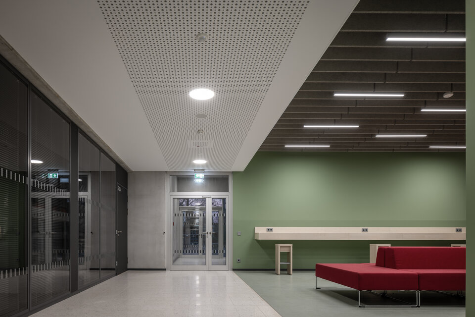 Zur Zonierung der Übergänge zwischen Flur- und Klassenraumbereichen kamen Glastrennwände des Typs Lindner Life Stereo 125 zum Einsatz. Sie ermöglichen innerhalb der Cluster eine hohe visuelle Durchlässigkeit und fördern damit Transparenz sowie Orientierung im Gebäude. Gleichzeitig bieten sie eine wirksame Schalldämmung zwischen den Nutzungsbereichen.