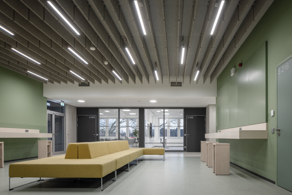 Der innere Aufbau des Neubaus folgt dem Konzept der Clusterschule. Im Gegensatz zur traditionellen Flurschule werden die Jahrgangsstufen in klar definierten Clustern organisiert. Diese Cluster funktionieren als eigenständige Lerneinheiten innerhalb der Gesamtstruktur und ermöglichen kurze Wege sowie eine eindeutige Orientierung im Gebäude. Die offenen Lernlandschaften verbinden Unterrichtsräume mit Differenzierungszonen, Aufenthalts- und Rückzugsbereichen zu eigenen Raumgruppen.