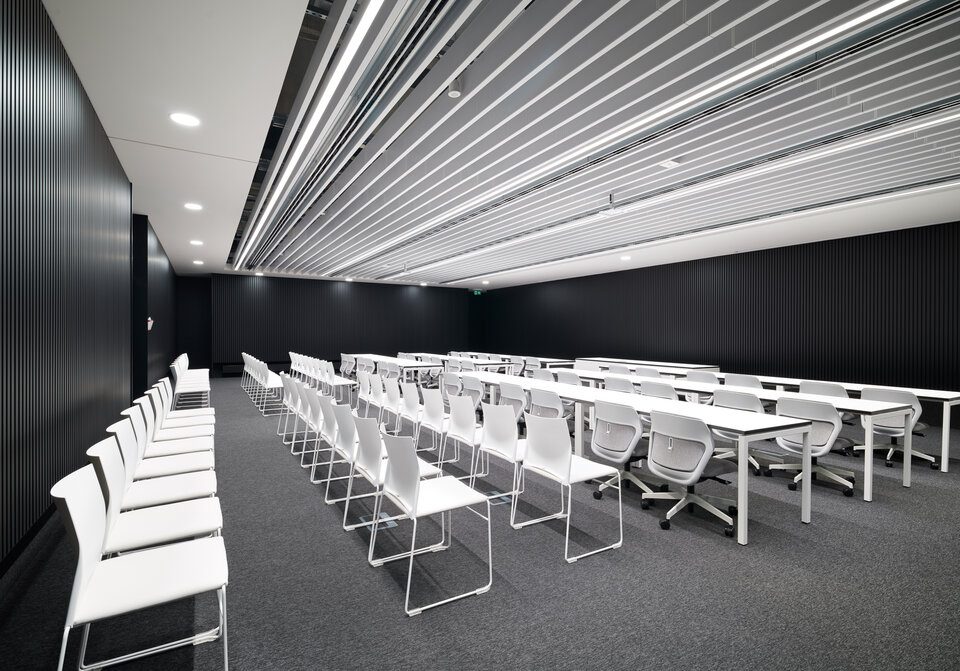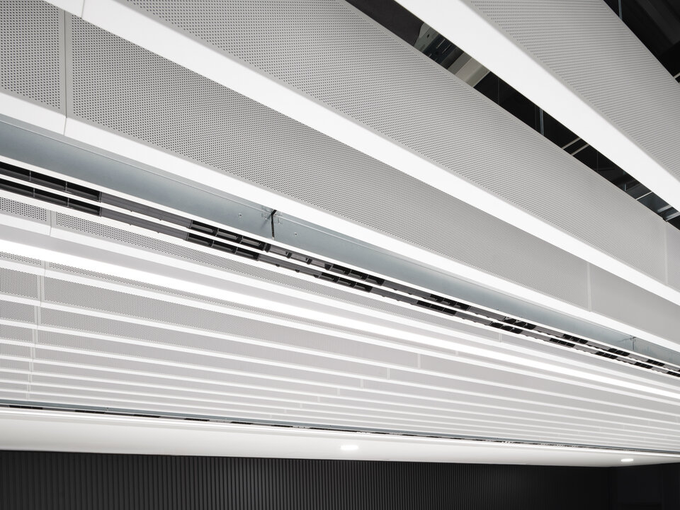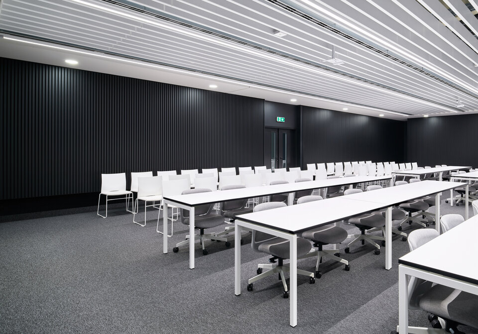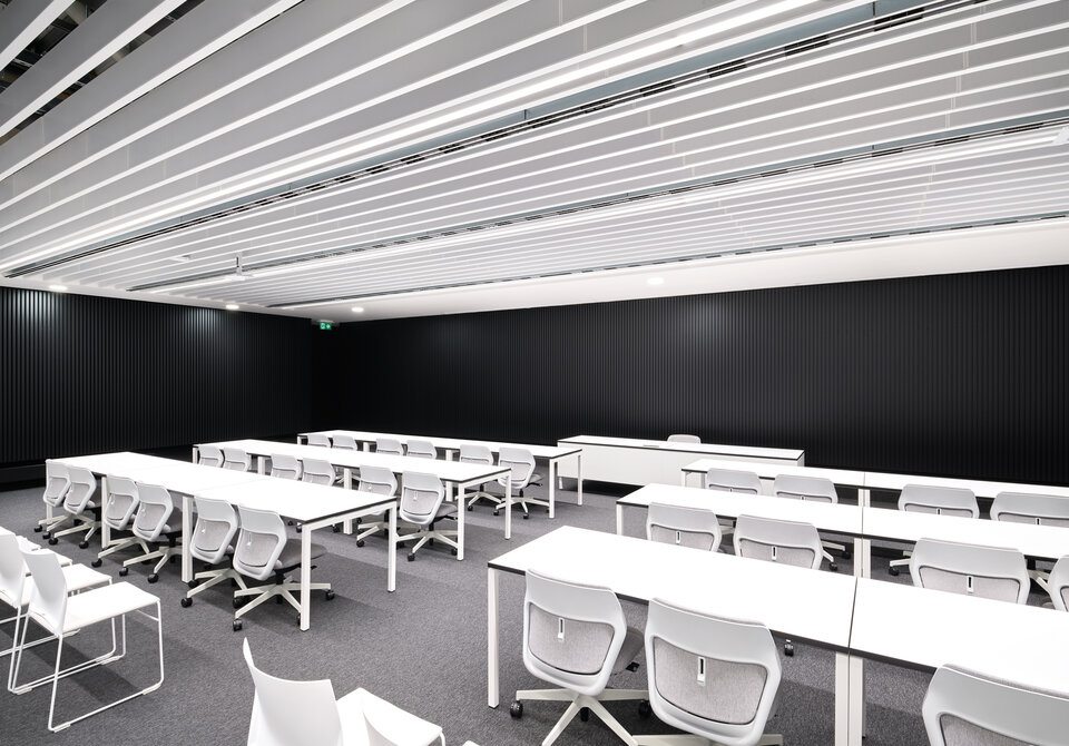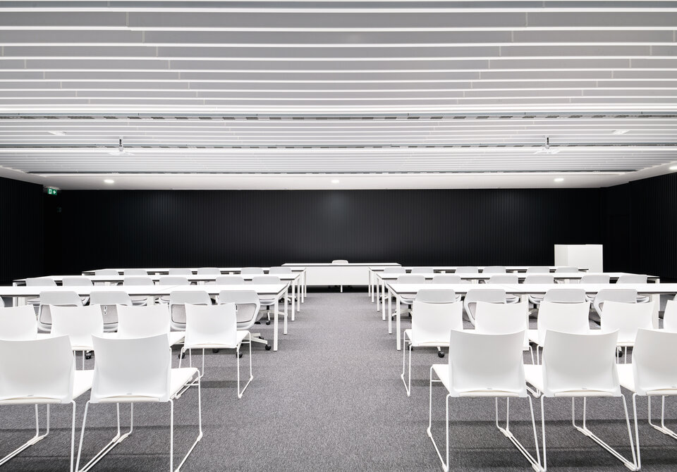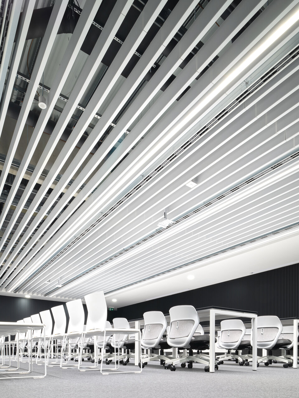 Die Lindner Group verantwortete die Planung und Umsetzung der Metalllamellenlösung, abgestimmt auf die funktionalen und baulichen Rahmenbedingungen des Projekts. Das Deckensystem wurde passgenau für die Nutzung als Schulungs- und Präsentationsraum sowie auf die Anbindung an das bestehende Verwaltungsgebäude konzipiert.