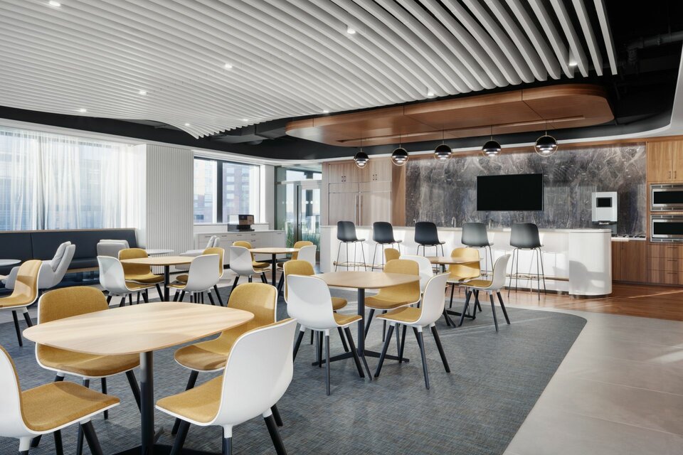Die Lindner LAOLA Metalllamellendecke im wellenförmigen Design wurde im Büro eines New Yorker Finanzinstituts eingesetzt, um dem Raum eine dreidimensionale Ästhetik zu verleihen.