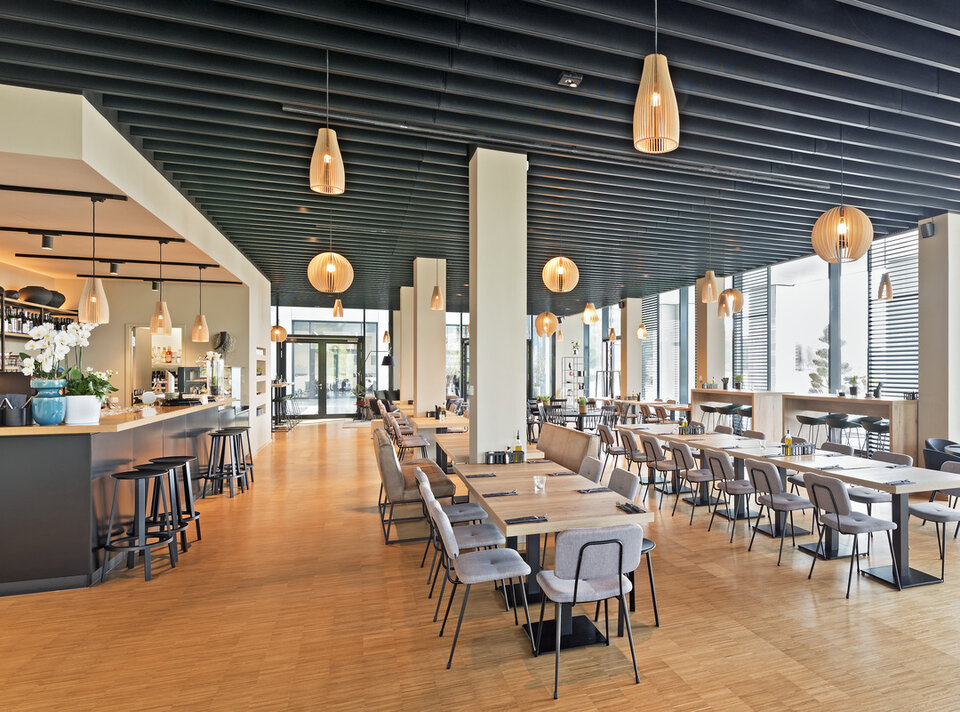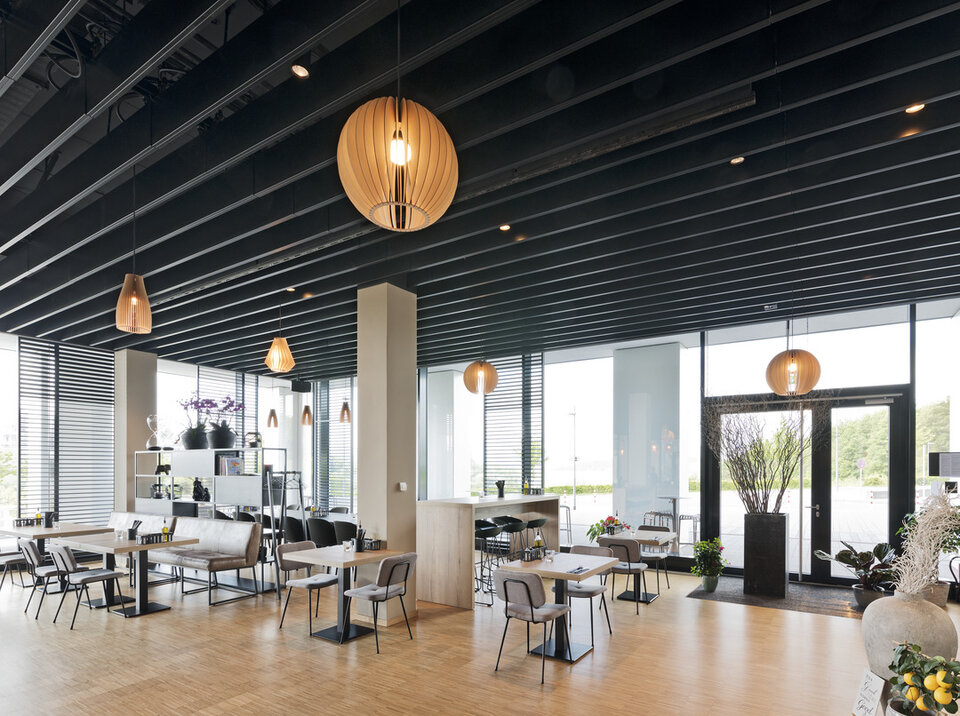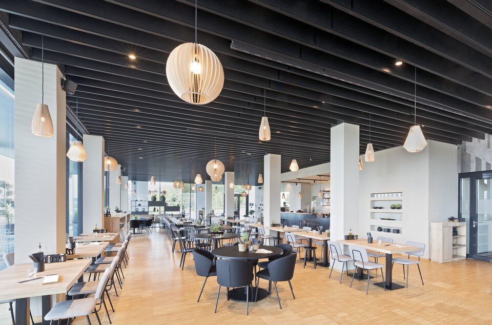 Zu diesem Projekt trug Lindner mit Heiz-/Kühldecken in der Ausführung als Lamellendecke bei. Die Decke leistet nicht nur seinen Beitrag zur Temperaturregulierung in der Kantine, sie wirkt sich zudem durch die Perforation positiv auf die Raumakustik aus.