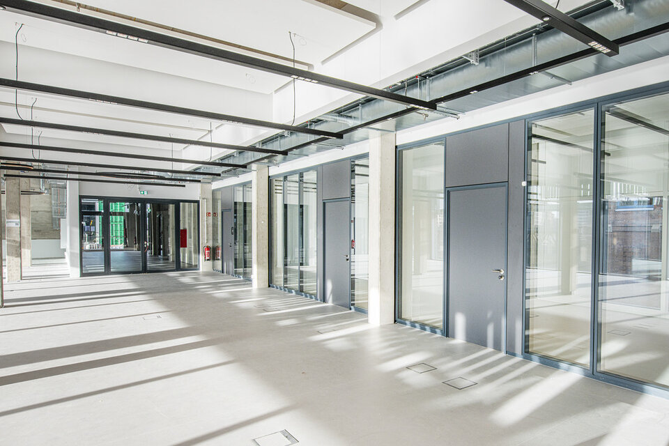 Im Innenausbau setzte man auf recycelte bzw. recycelbare Materialien und Energieeffizienz, wie z. B. bei der Stahlkonstruktion für den schwebend wirkenden „Expeditionsraum“ – einem 23 Meter langen Besprechungsraum zwischen Ebene 2 und 3. Für die vollflächigen Glaswände sowie für weitere Büro- und Arbeitsräume kamen Cradle to Cradle® geprüfte Glaswände vom Typ Lindner Life 125 Stereo zum Einsatz. Auch diverse Trockenbauarbeiten sowie die Montage von energieeffizienten Deckensegeln und mobilen Trennwänden stammen von Lindner.