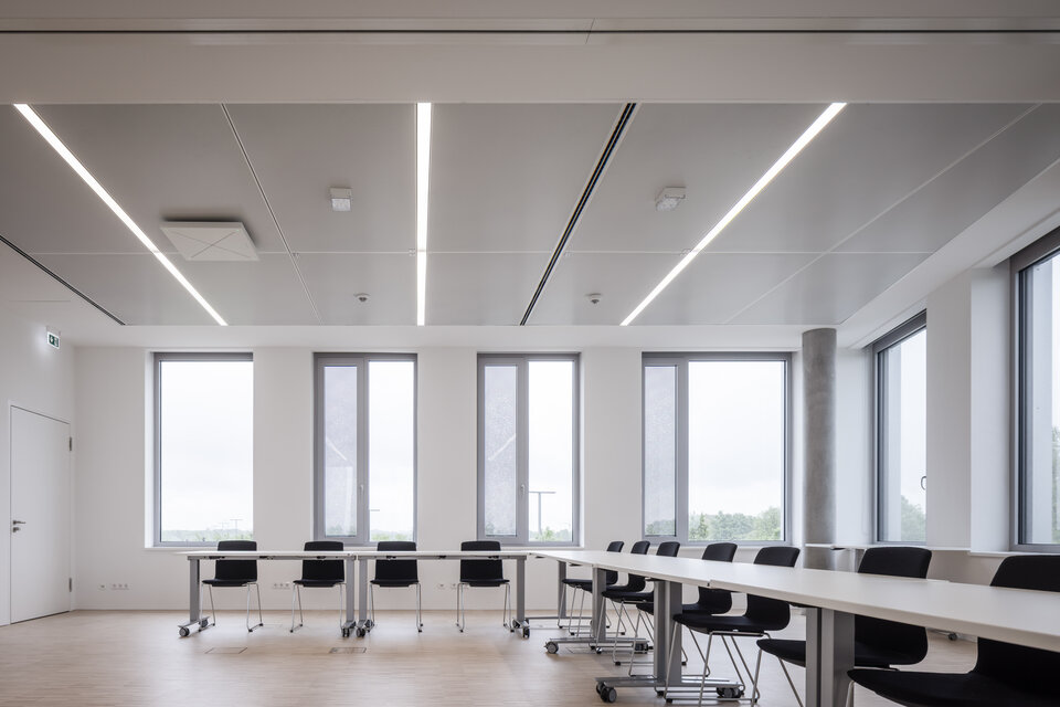 Durch die Kombination aus leistungsfähigen Ausbaugewerken, integrierten Deckensystemen und flexibel nutzbaren Raumstrukturen entstand eine Arbeitsumgebung, die sowohl den technischen Anforderungen des Forschungsbetriebs als auch den Bedürfnissen moderner Büroorganisation gerecht wird. Die umgesetzten Lösungen fügen sich funktional und gestalterisch in das Gesamtkonzept des Institutsgebäudes ein und unterstützen nachhaltige, effiziente Arbeitsprozesse im Forschungsalltag.