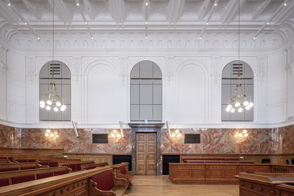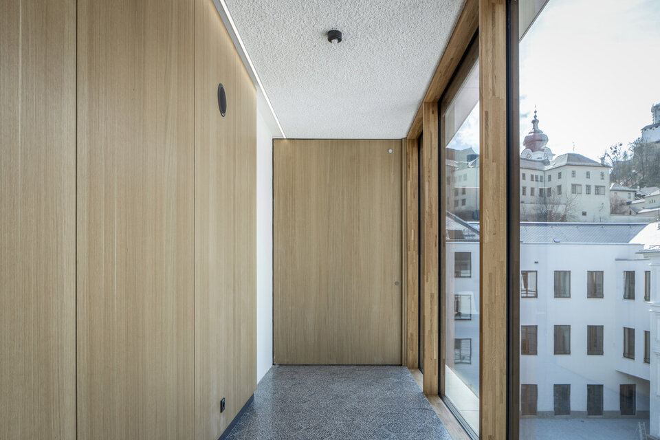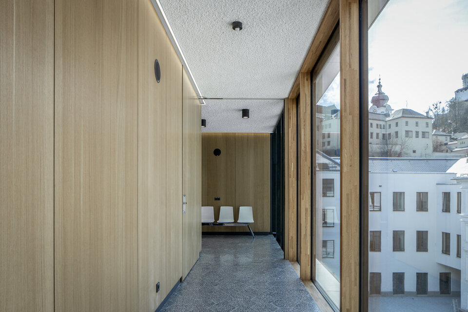 Zwischen dem Ufer der Salzach und der Festung Hohensalzburg liegt das Justizgebäude Salzburg. Das prunkvolle Gebäude aus der Kaiserzeit beherbergt eines der größten Landesgerichte Österreichs. Nach 1970 erweiterte man den Bau zum ersten Mal durch einen Zubau im Innenhof. Zwei der zu dieser Zeit entstandenen Zellentrakte sowie ein weiterer Zubau wurden nun durch einen Y-förmigen, offenen Neubau ersetzt, der die historischen Bestandsgebäude miteinander verbindet und mit viel Holz und Glas für mehr Transparenz sorgt. Der historische, denkmalgeschützte Teil des Justizgebäudes hat eine aufwendige Sanierung erfahren, die gleichzeitig Denkmalschutz, Brand-, Rauch- und Schallschutz sowie ein spezielles Sicherheitskonzept berücksichtigt.