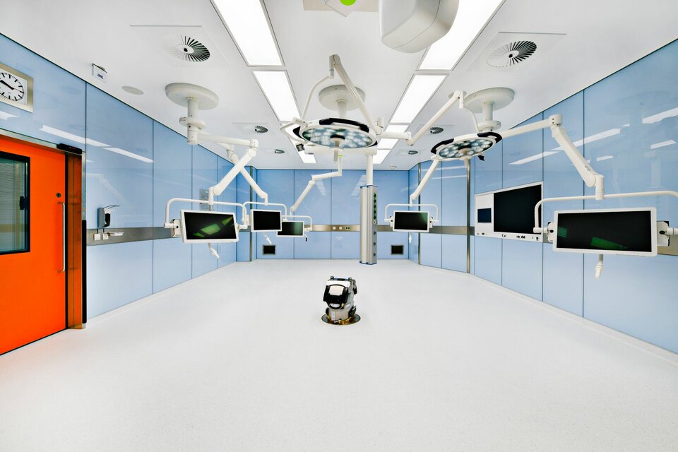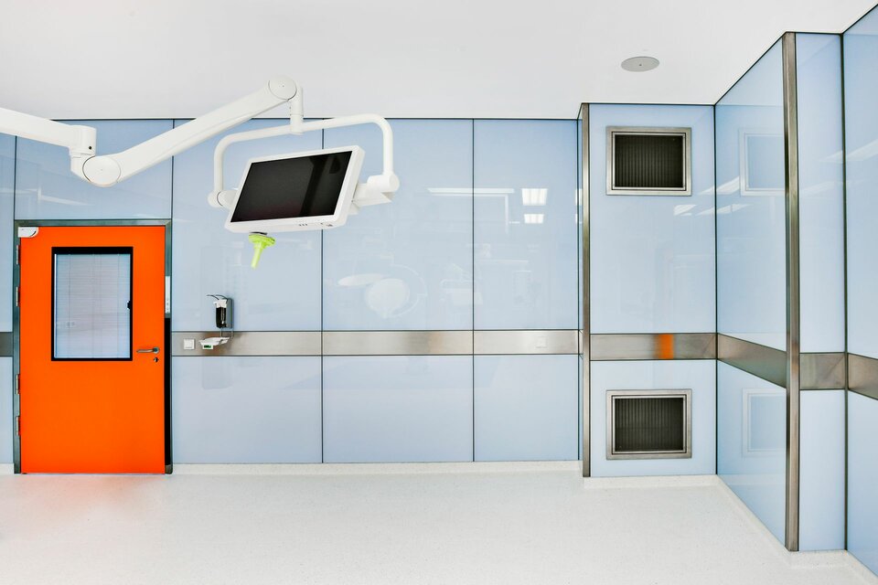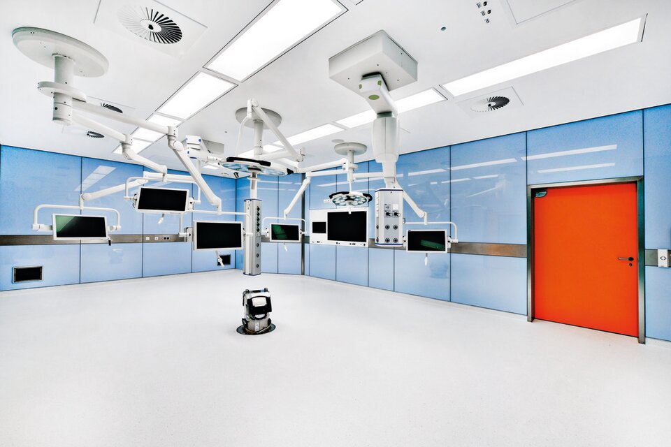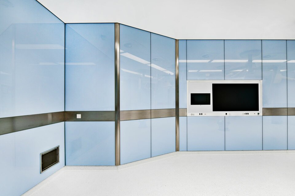 Lindner SE | Reinraumtechnik hat zum Ausbau der 14 OP-Säle beigetragen. Mit Gipskartonwänden wurden die Räume vom Flur abgegrenzt, der Zutritt erfolgt über Schiebe- bzw. Drehtüren. Die Drehtüren wurden mit Antrieben ausgestattet und sind teilweise mit T30-Brandschutz ausgeführt. In den OP-Sälen wurden Glas-Wandverkleidungen erstellt, eine hygienisch einwandfreie Lösung die verschiedene Einbauten wie z. B. Lüftungselemente und Bildschirmeinsätze nahtlos aufnimmt und die Haustechnik optisch ansprechend verbirgt. Aus technischer Sicht ergab sich die übergreifende Anforderung für alle Produkte, einen Strahlenschutz von 0,5 und bis zu 1,5 Pb zu gewährleisten.