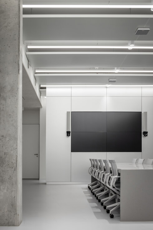 Für den Mieterausbau der Omron-Büroflächen übernahm die Lindner Group mit den Geschäftsbereichen Mieterausbau | Design & Build und Lindner SE | Objektdesign umfangreiche Innenausbauleistungen und lieferte die passenden Produkte. Hierzu zählten maßgefertigte Wand- und Deckenbekleidungen sowie die rahmenlose Systemtrennwand Lindner Life Clear. Diese Glaswand ermöglicht nicht nur eine transparente Raumaufteilung, sondern bietet auch eine hohe Schallisolierung mit einem Wert von Rw 49 dB.