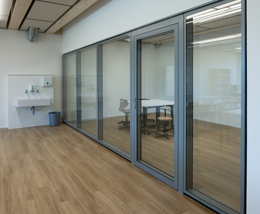 Für die Raumtrennung kam das System Lindner Life Stereo 125 zum Einsatz – eine Systemtrennwand aus Glas, die Transparenz mit funktionaler Leistungsfähigkeit vereint. Sie erfüllt hohe Anforderungen an Schallschutz und Brandschutz und bietet gleichzeitig gestalterische Offenheit. Die Verwendung von Hydro Low-Carbon Aluminium in den Wandprofilen trägt zu niedrigeren CO2-Werten des Gebäudes bei und unterstreicht den Anspruch an Nachhaltigkeit und Ressourcenschonung.