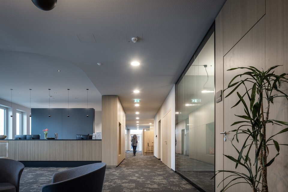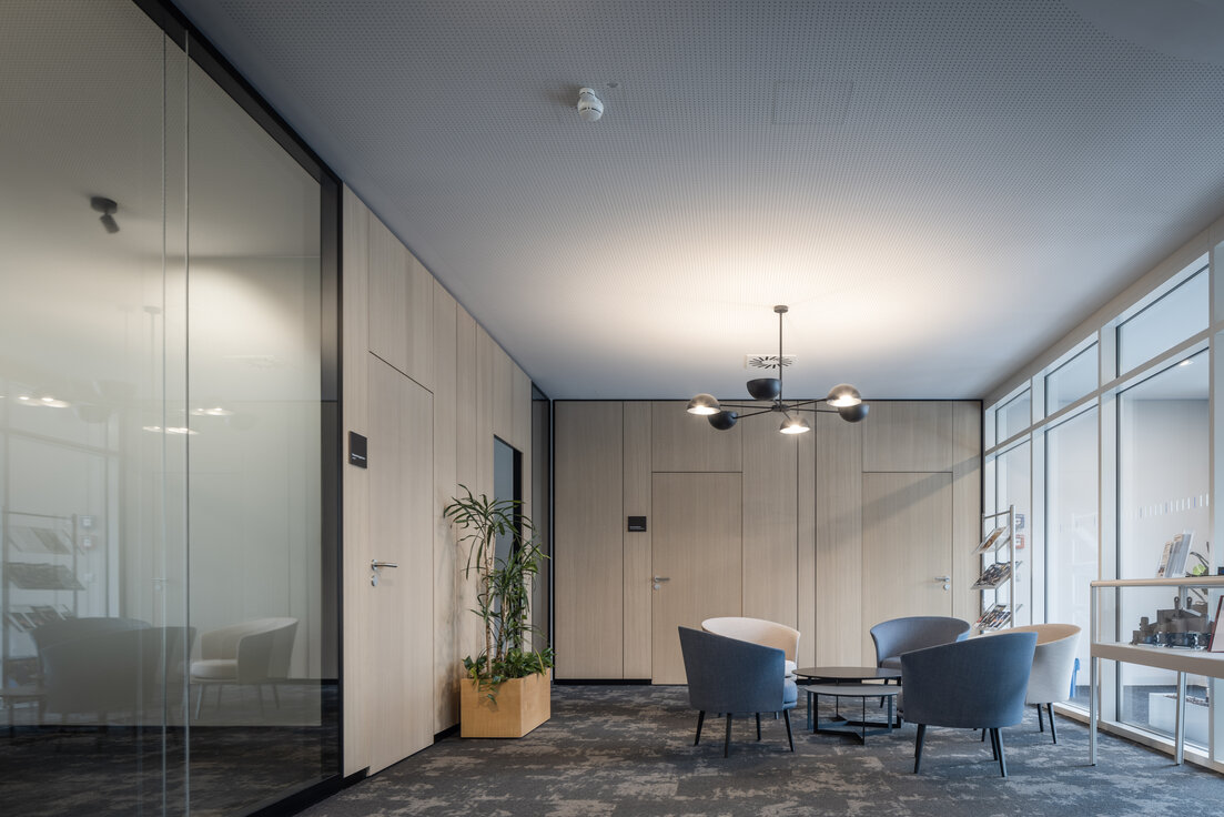 Die Lindner Life Stereo 125 Glastrennwände sorgen für eine helle, transparente Atmosphäre – ohne dabei auf effektiven Schallschutz zu verzichten. Ergänzend bringen Lindner Logic 100 Timber Holztrennwände eine warme, natürliche Eleganz in die Räume und fügen sich harmonisch in das moderne Design ein. Die HTB 68 und HTB 41 Türen mit Schalterpaneelen integrierten sich optisch perfekt in das Gesamtkonzept und bieten darüber hinaus komfortable Steuerungsmöglichkeiten für Licht und Technik.