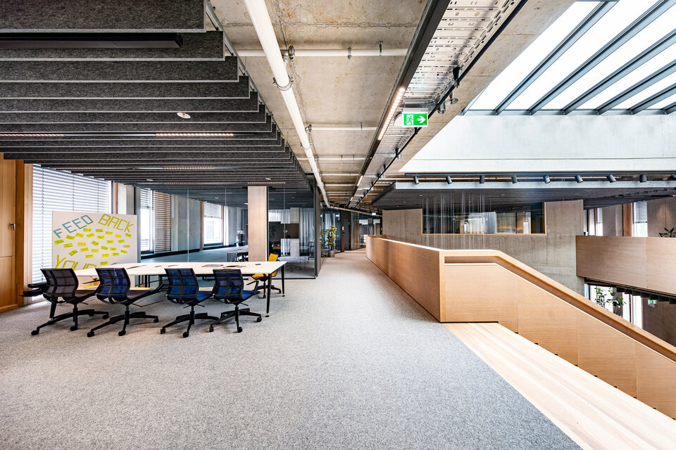 Ein Schwerpunkt lag dabei auf der Raumakustik: Rund 70.000 lfm Lindner MUTE+® board Akustikbaffeln wurden in den offenen Büroflächen, Kommunikationszonen und entlang der Magistrale installiert und schaffen ausgewogene akustische Bedingungen. Farbgestaltung und Oberflächen sind auf das Corporate Design von DACHSER abgestimmt und fördern eine ruhige, konzentrierte Arbeitsatmosphäre.
