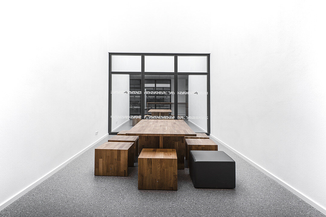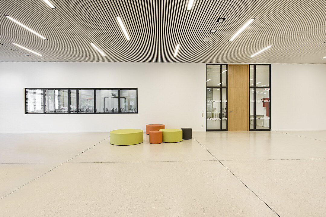 Die Innenraumgestaltung reduzierte man auf ruhige und harmonierende Materialien, wie Glas, Beton und Holz. Einblicke in die einzelnen Fach- und Unterrichtsräume ermöglichen raumhohe Lindner Life Stereo 125 Glastrennwände mit Dreifachverglasung, eingefasst in schwarzen, umlaufenden Alurahmen, die farbige Akzente in der sonst hellen Wandgestaltung setzen. Kombiniert werden diese mit massiven Holztüren inkl. Holzzargen und Glastüren mit Aluminiumrahmen.