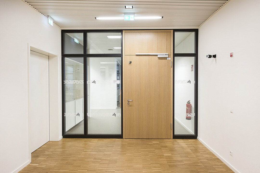 Die Türen und Trennwände weisen den Bestimmungen im Schulbau entsprechend Brand-, Rauch-, Schallschutz auf, ebenso wie die Brüstungsverglasung hin zum zentral gelegenen Atrium und die Sichtfenster als Verbindungselement zwischen den einzelnen Fachräumen und Fluren.