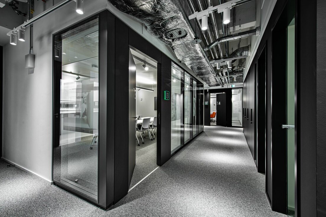 Aufgrund großer Maßtoleranzen und komplexer geometrischer Anforderungen stellte der Trockenbau eine besondere Herausforderung dar. Dank der engen Zusammenarbeit zwischen allen Beteiligten und der Kombination aus konventionellem Trockenbau, perforierten Gipsdecken und den Glastrennwänden konnte dennoch ein hochwertiges und modernes Raumkonzept realisiert werden.
