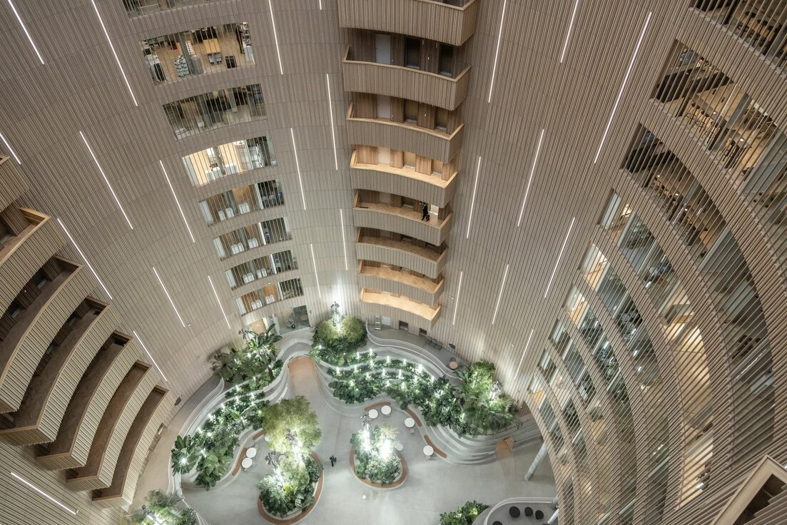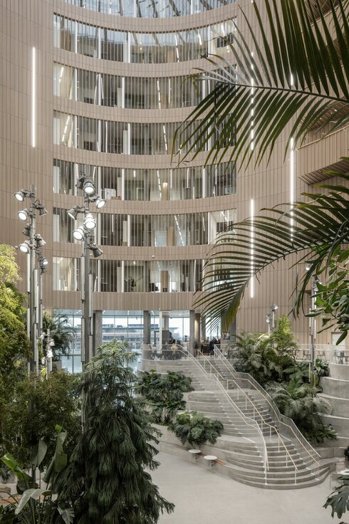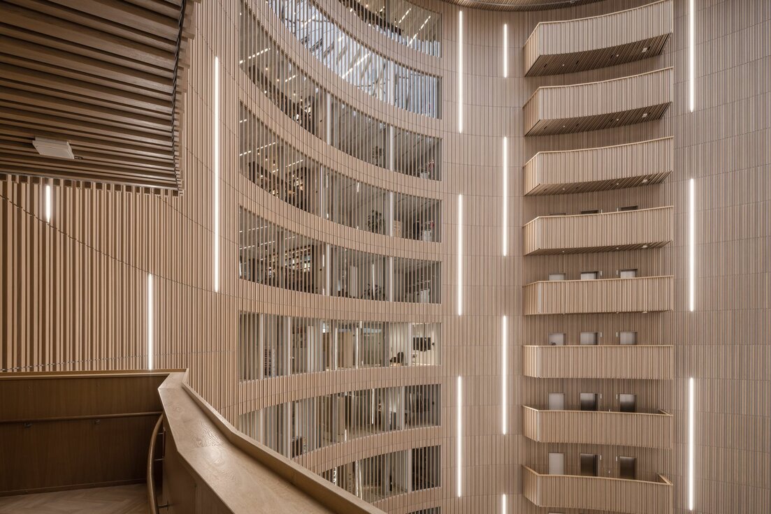 Unterstrichen wird der einzigartige Charakter des Atriums durch 58.000 Lfm der RIBline Wand- und Deckenverkleidung in den öffentlichen Bereichen, welche Lindner IPC für das Projekt realisierte. Die Lamellen in Echtholzfurnier überzeugen vor allem durch ihren nachhaltigen Gipskern, der das System gemäß EN 13501 feuerresistent macht. Diese Eigenschaft minimiert auch die Rauchentwicklung und verhindert die Tropfenbildung, was die Evakuierung des Gebäudes erleichtert. Der in der Verkleidung verwendete FGD Gips wird zudem aus Altpapier hergestellt und ist zu 100 % recycelbar. Ergänzend sorgen Lindner Kühldecken auf einer Fläche von 16.000 m2 für ein stets angenehmes Raumklima in den Büro- und Mietflächen.