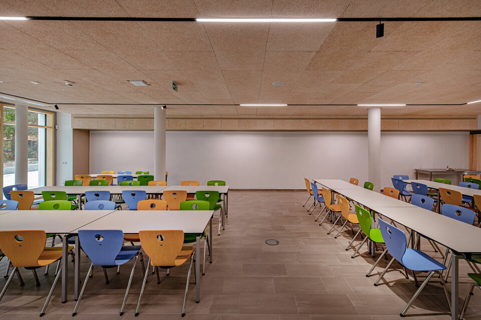 Ein weiterer Fokus lag auf dem Einsatz von Troldtekt® Akustiksystemen. Die Akustikplatten eignen sich sowohl für Decken- als auch für Wandverkleidungen und verbinden schallabsorbierende Eigenschaften mit einer klaren, zurückhaltenden Gestaltung. So tragen sie spürbar zur Reduzierung des Geräuschpegels bei und unterstützen konzentriertes Lernen im Schulalltag.