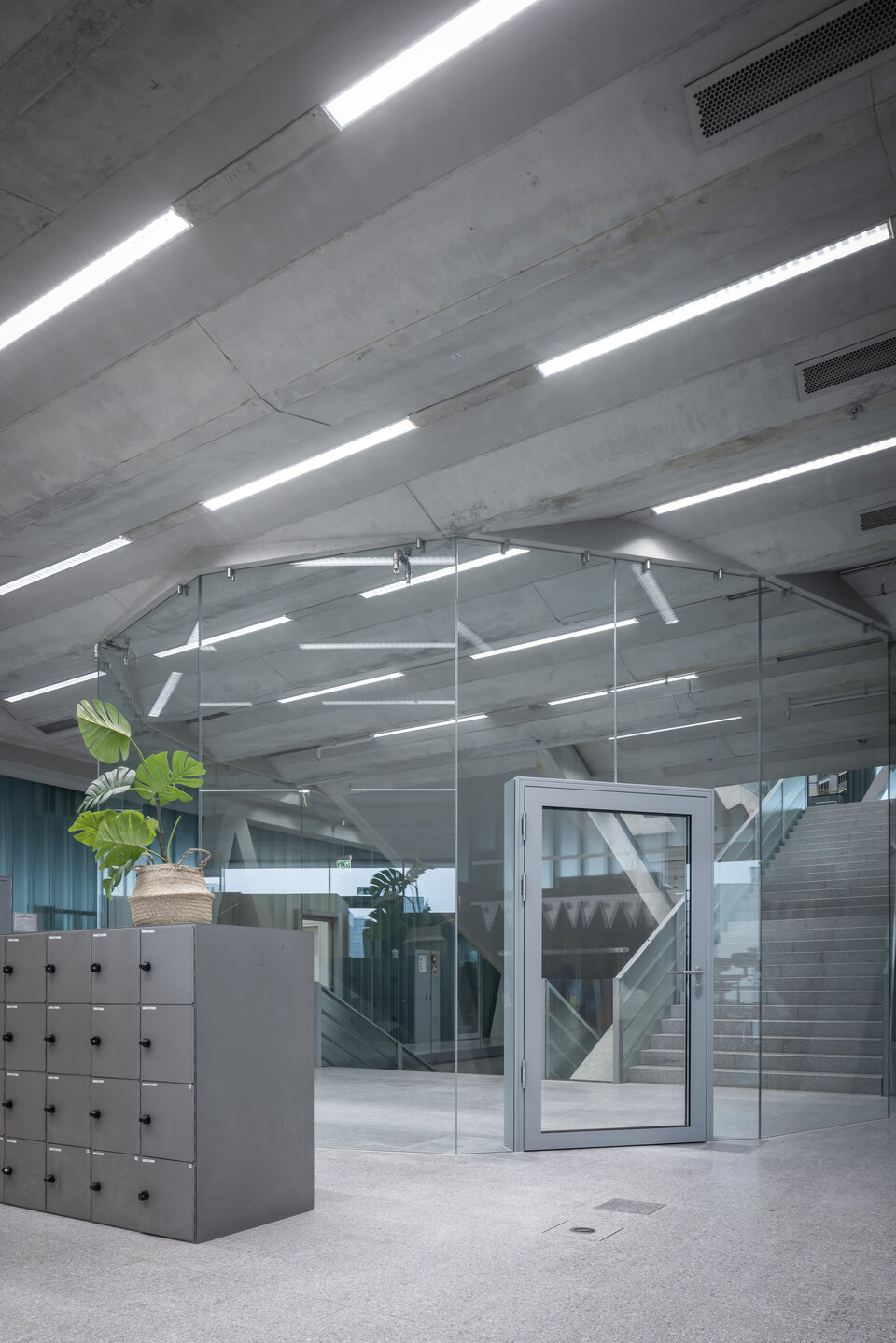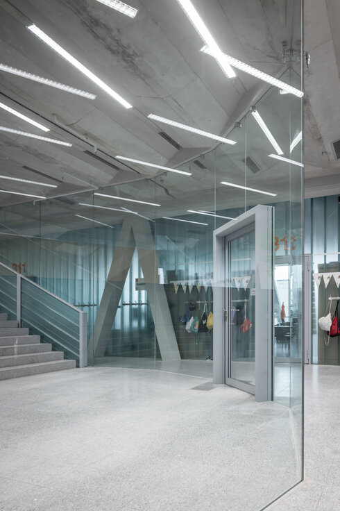 Die Schweizer Niederlassung der Lindner SE übernahm bei diesem Projekt zentrale Bauleistungen unter besonders herausfordernden Bedingungen. Fokus lag bei Lindner auf der Ausstattung der Treppenhäuser mit Glaselementen und freistehdenden Rohrrahmentüren: Lindner Life Pure Ganzglaswände wurden als Sonderlösung ohne sichtbare Profile realisiert. Stattdessen kam eine Punkthaltung an der Decke sowie ein verdeckter Anschluss im Bodenbereich zum Einsatz, die sowohl die gewünschte Glas-Beton-Optik als auch die Erdbebensicherheit erfüllt.
