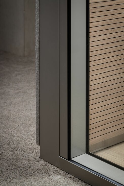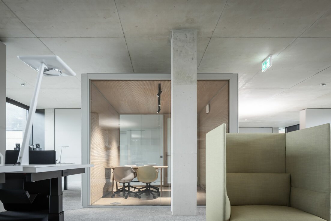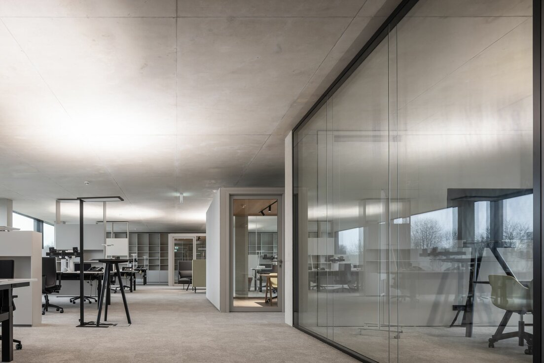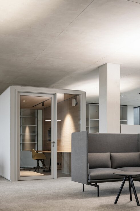 Mit flexiblen, modular aufgebauten Cubes bietet Lindner die ideale Ergänzung in den sonst offenen Raumflächen. Die Raum-in-Raum Systeme ermöglichen ungestörte Gespräche und konzentriertes Arbeiten bei optimalen Raumklima und können individuellen Bedürfnissen angepasst werden. Bei Änderungen und Aufteilungen können die Cubes auch im Raum versetzt oder komplett rückgebaut und in anderen Bereichen wiederverwendet werden. Weitere Systemtrennwände aus Glas tragen mit ihrer transparenten Gestaltung dazu bei, dass das natürliche Licht bestmöglich genutzt wird und die Offenheit der Fläche erhalten bleibt. Integrierte Jalousien bieten zusätzliche Flexibilität und Privatsphäre.