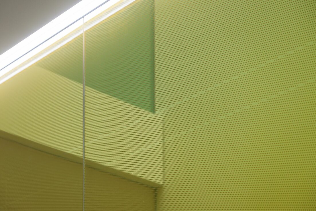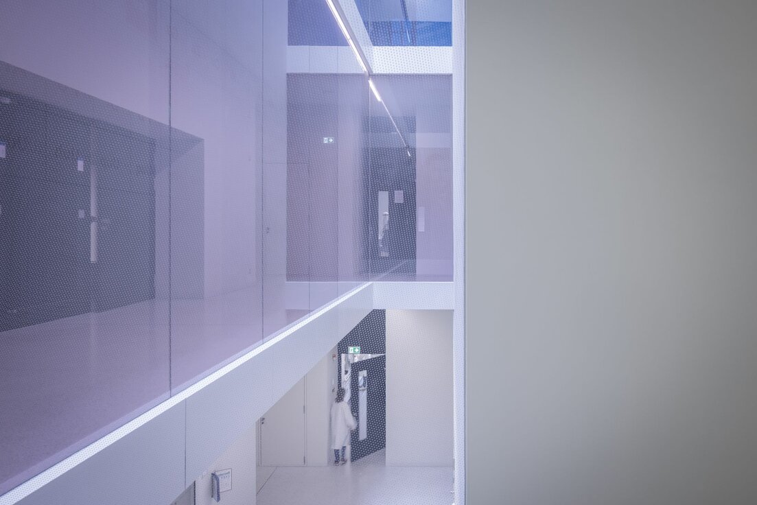 Beim Innenausbau spielte die Lindner Group mit der Umsetzung von absturzsicheren Verglasungen der Lichthöfe eine wichtige Rolle. Hierfür verbaute Lindner die Ganzglaswand Lindner Life Pure 620 inklusive aller Metallverkleidungen der einzelnen Geschosskanten. Die Lindner Life Pure 620, erhältlich in verschiedenen Glasstärken, besticht durch ihre pfostenfreie Verglasung, die die offene und transparente Optik zusätzlich verstärkt. Dies ermöglicht maximale Helligkeit und vermittelt ein Gefühl von Weitläufigkeit. Als besonderer Eyecatcher wurden die Verglasungen verschieden farbig mit dem Periodensystem bedruckt. Dabei war darauf zu achten, dass ein exakter, durchgängiger Verlauf von Scheibe zu Scheibe entstand. Der Höhentransport der Einzelkomponente wurde mittels eines Spinnenkrans im Lichthof realisiert. Auch hier war exaktes Arbeiten und gute Abstimmung im Team nötig, um einen reibungslosen Einbau und ein beeindruckendes Ergebnis zu schaffen.