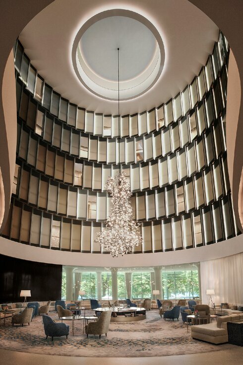 Das äußere Erscheinungsbild des The Fontenay ist geprägt durch organisch fließende Linien, welche sich in konkav und konvex geformten Wellen ausdrücken. Der daraus resultierende Grundriss stellt drei miteinander verschliffene Kreise dar, was zur Folge hat, dass sich über die gesamte Konstruktion hinweg nur sehr wenige rechte Winkel ergeben. Für die strahlend weiße Erscheinung des Hotels sorgt eine Fassade mit horizontalen Bändern aus Glasflächen und großformatigen, weiß glasierten Ziegelplatten. Die Lindner Fassaden GmbH war für die Erstellung der Fassade des The Fontenay verantwortlich. Eine besondere Herausforderung war es dabei, die dynamischen Schwünge der Fassade mit ihren Radien von 1.500 bis 22.000 mm über die vorgehängte hinterlüftete Keramikfassade abzubilden. Dafür wurden umlaufend großformatige Keramikplatten mit Längen von 1.200 bis 1.550 mm erstellt, während die statische Auslegung der Innenwände diese Konstruktion prinzipiell erst möglich machte. Bei den Glasflächen handelt es sich um Pfosten-Riegel-Systeme, in die auf Höhe der Zimmer rahmenlose Skyframe-Schiebefenster eingearbeitet wurden. Neben der Außenfassade war Lindner ebenfalls für die Fassaden der beiden Innenhöfe verantwortlich. Im luftigen Atrium wurde eine mit LED beleuchtete Stahlfassade als besonderes Design-Feature geschaffen. Der offene Patio ist dank einer großzügig verglasten Fassade lichtdurchflutet.
