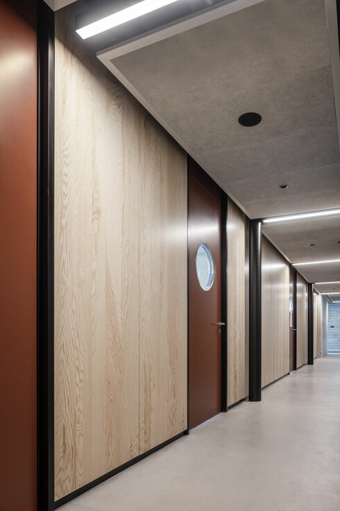 Hier war Lindner für sämtliche Büro- und Sitzungswände inkl. der Türanlagen, zum Teil mit Sicherheitszugängen und intergerierten Schalterpanels zuständig. Dabei wurde das Design der Oberflächen an den schlicht funktionalen, ruhigen Material- und Farbmix angepasst. Neben rot lackierten Holztüren, die speziell mit Bullaugenfenstern gefertigt wurden, finden sich vor allem Holztrennwände und Wandverkleidungen in furnierter Seekiefer Optik wieder.