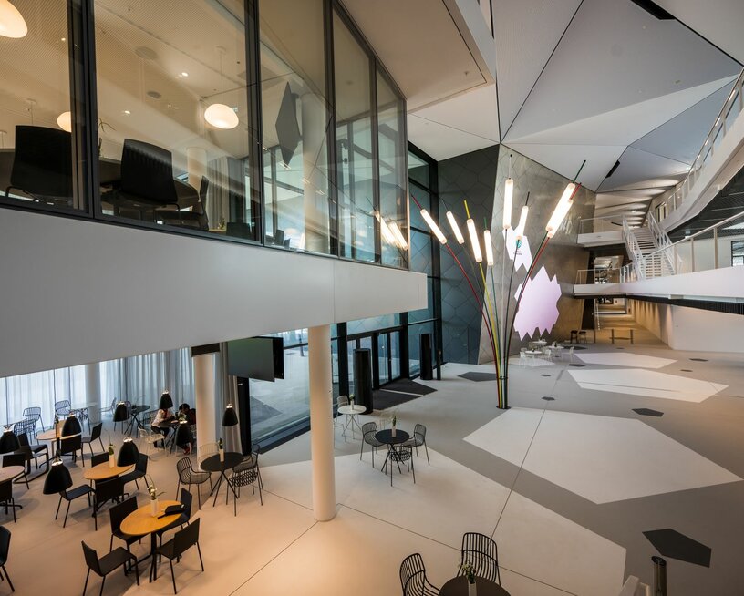 Ein besonderes Innenausbau-Highlight stellen dabei die projektspezifische Wandbekleidungen der Lindner Group im Boulevard des Gebäudes dar: bestehend aus fünfeckigen Tafeln, erinnert das Design der Wandbekleidung an die Wabenstruktur eines Fußballs. Mehr als 300 Stück wurden hierfür von Lindner verbaut und um zwei LED-Bildschirme in den Wandflächen ergänzt. Die hochwertige Metalltäfelung unterstreicht dabei die auf den Bildschirmen gezeigten Momente des deutschen Fußballs. Weitere goldfarbene und mit Folierungen versehene Metallwandbekleidungen geben Besucher heute außerdem einen Überblick über den DFB und seine Mitgliedsverbände. Abgerundet wird der moderne Charakter der Akademie mit Lindner Wandbekleidungen aus grauem Metall in den Gangbereichen rund um den Aufzügen im Boulevard des Campus.