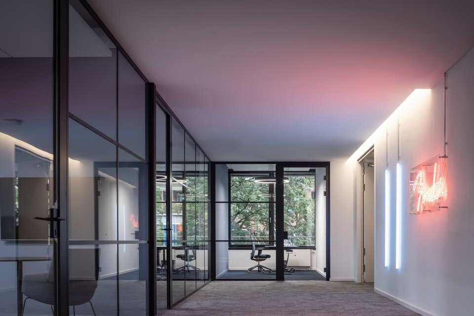 Im Fokus stand die Schaffung eines inspirierenden Arbeitsumfelds, das kreative Prozesse fördert und zugleich funktionalen Anforderungen gerecht wird. Das Glastrennwandsystem Lindner Life Pure 620 bietet darüber hinaus einen hohen Schallschutz bei maximaler Transparenz und Tageslichtdurchflutung. Dekorative Holzlamellen setzen nicht nur ästhetische Akzente, sondern verbessern auch spürbar die Raumakustik. Die Trockenbauwände wurden zudem mit einer handveredelten Spachteltechnik in Echtbetonoptik gestaltet und verleihen den Räumen damit eine außergewöhnliche Tiefe und Charakter.